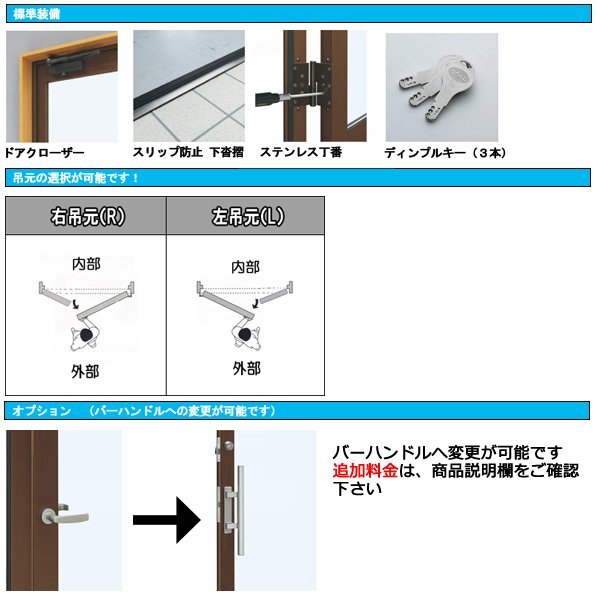 | 注意事項 | ▲ ドアノブをオプションにてバーハンドルに変更できます、追加 10.400円 ▲ 商品の発送は決済終了後、5~6日(土日・祝日は除く)にて発送致します。 (在庫の関係にて遅れる場合もありますが、メールにて出荷時期を連絡いたします) ▲ 沖縄・離島・一部地域のお客様への配送は、質問にて御相談頂けますと幸いです。 |