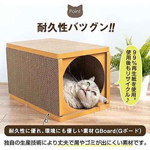 商品紹介 耐久性に優れ、GBoardと呼ぶフラットで強力な紙パネルで作られている、つめとぎ付きキャットハウス。 壁面には爪とぎがあり、愛猫ちゃんが喜びます。 猫ちゃんは狭い所が大好き(=^・・^=) 猫ちゃんのくつろぎのお部屋になります。 リサイクル紙で作られており環境にやさしく、処分も簡単で費用が掛かりません。 見た目もシンプルで、どんなインテリアにもマッチします。 原材料・成分 紙 安全警告 使用上の注意:・本製品は猫専用です。本来の用途以外には使用にならないでください。・無理な力をかけると破損するおそれがありますのでご注意ください。・火気や水気のあるところでの使用はしないでください。・人が乗ったり本製品の上に重たいものなどを乗せないでください。破損の原因になります。・高いところ、不安定な場所に設置しないでください。直射日光が当たる場所や、高温、多湿になる場所での設置はしないでください。