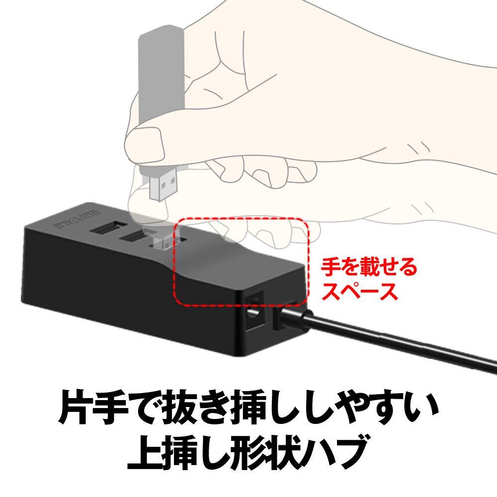 【特長】 実は製造するのが難しいUSBハブだから、高品質にこだわったUSB3.0対応上挿し4ポートハブ 【そもそもUSBハブってなに?】 パソコンなどに複数のUSB機器を接続するための分配機。 本製品を使えばUSB機器を4台接続可能に。 【外付けHDDに最適な上挿し形状】 上挿し形状だから他のポートに干渉しにくく、セルフパワーで外付けHDDに最適。 【マグネット付だからデスクに最適】 机の上や側面に設置できるマグネット付。ケーブルにつられてハブが動かず固定できる。 【USB3.0対応で高速転送】 USB2.0の10倍以上の最大転送速度(※規格値の比較)であるUSB3.0に対応し、高速転送を実現。 【高品質設計】 品質にこだわり、電磁ノイズを低減しVCCI ClassBを取得。また他のUSB機器との接続相性の信頼性試験を実施し、安心してお使いいただける仕様に。 【1mのロングケーブルで接続しやすい】 1mのロングケーブルで、PCやTV裏面のUSBポートなどから手元にハブを設置できる。 【複数のUSB1.1機器を接続しても高速転送】 USB1.1をUSB2.0の高速転送を各ポートで変換するMultiple Transaction Translator機能を搭載。 【】