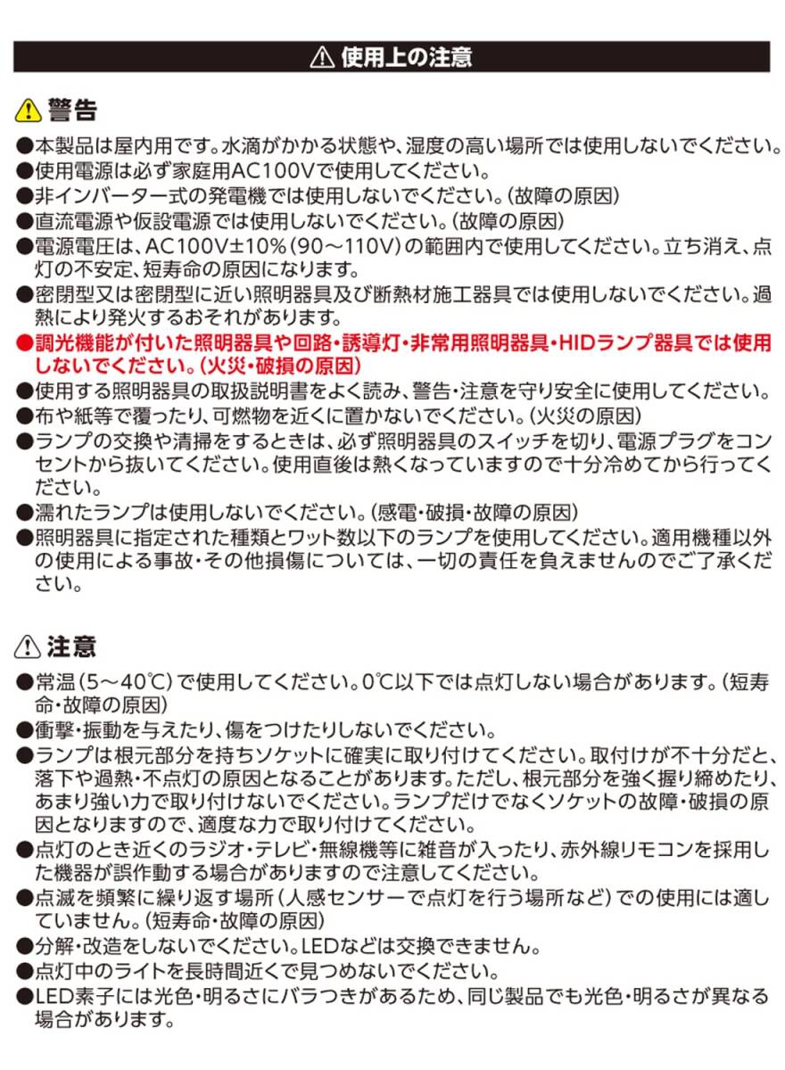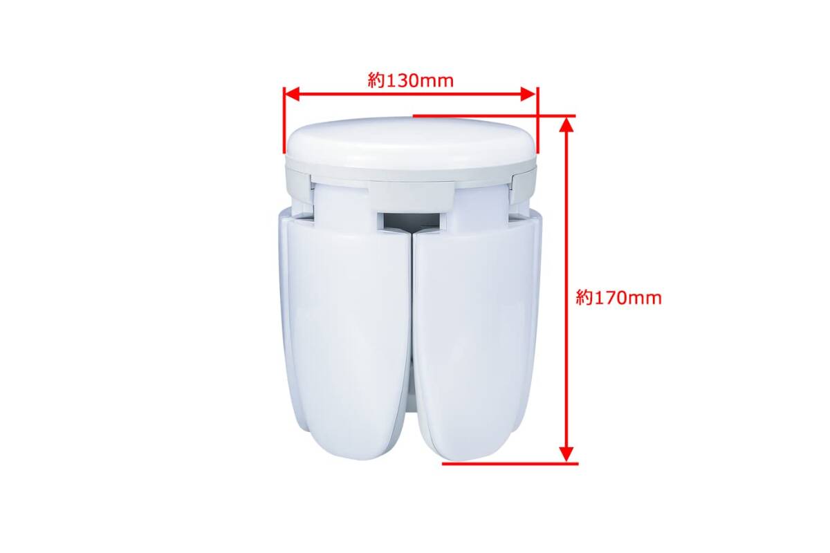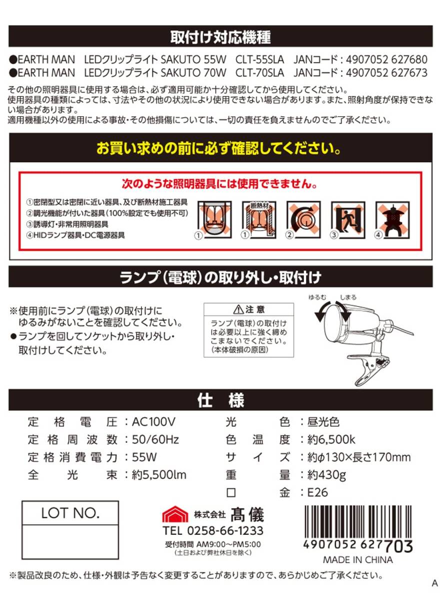 説明 SAKUTO用交換ランプ 光革命 開閉で照射範囲が変わる。 閉じて広範囲照射。(最大約300°照射) 開いて前面照射。 全光束5 500lm 昼光色 5枚羽 取付け対応機種 EARTH MAN LEDクリップライト SAKUTO 55W CLT-55SLA JANコード:4907052 627680 EARTH MAN LEDクリップライト SAKUTO 70W CLT-70SLA JANコード:4907052 627673 ※※お買い求めの前に必ず確認してください。※※ 次のような照明器具には使用できません。 (1)密閉型又は密閉に近い器具、および断熱材施工器具 (2)調光機能が付いた器具(100%設定でも使用不可) (3)誘導灯・非常用照明器具 (4)HIDランプ器具・DC電源器具