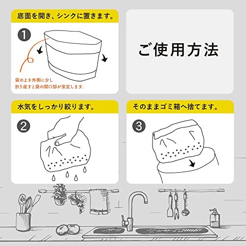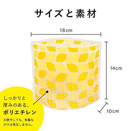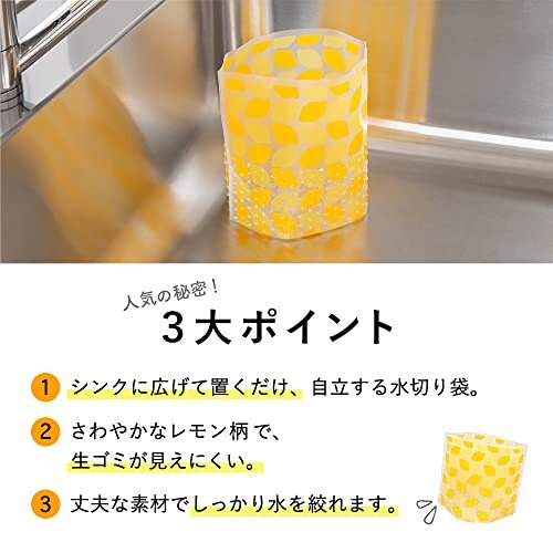 商品特長 ●三角コーナーがいらない自立する水切りゴミ袋です。 ●場所を選ばずにシンクが広く使えます。 ●さわやかなレモン柄で生ゴミが見えにくくなっています。 ●穴あきタイプでしっかり水切りが出来ます。 ●丈夫な素材で水分をしっかり絞れます。 ●製品自体、外装袋とも燃やしても有毒なガスは発生しません。(自治体の分別基準に従ってください。) 使用方法 ●底面が開きにくくなっています。底面を開いてからご使用ください。 ●袋を広げて、シンク内に置いてください。 ●袋の上部を外側に少し折り返すと袋の開口部が安定します。 ●ごみを入れ捨てる時は袋の上を折り、押さえるように水を絞ってください。 ●水を絞り、そのまま袋ごとゴミ箱に捨ててください。 使用上の注意 ●排水用の穴は開けずにそのまま使用してください。 ●カレーやシチューを一度に流すと目詰まりすることがありますのでご注意ください。 ●火のそばに置かないでください。 ●水切りゴミ袋以外の用途に使用しないでください。