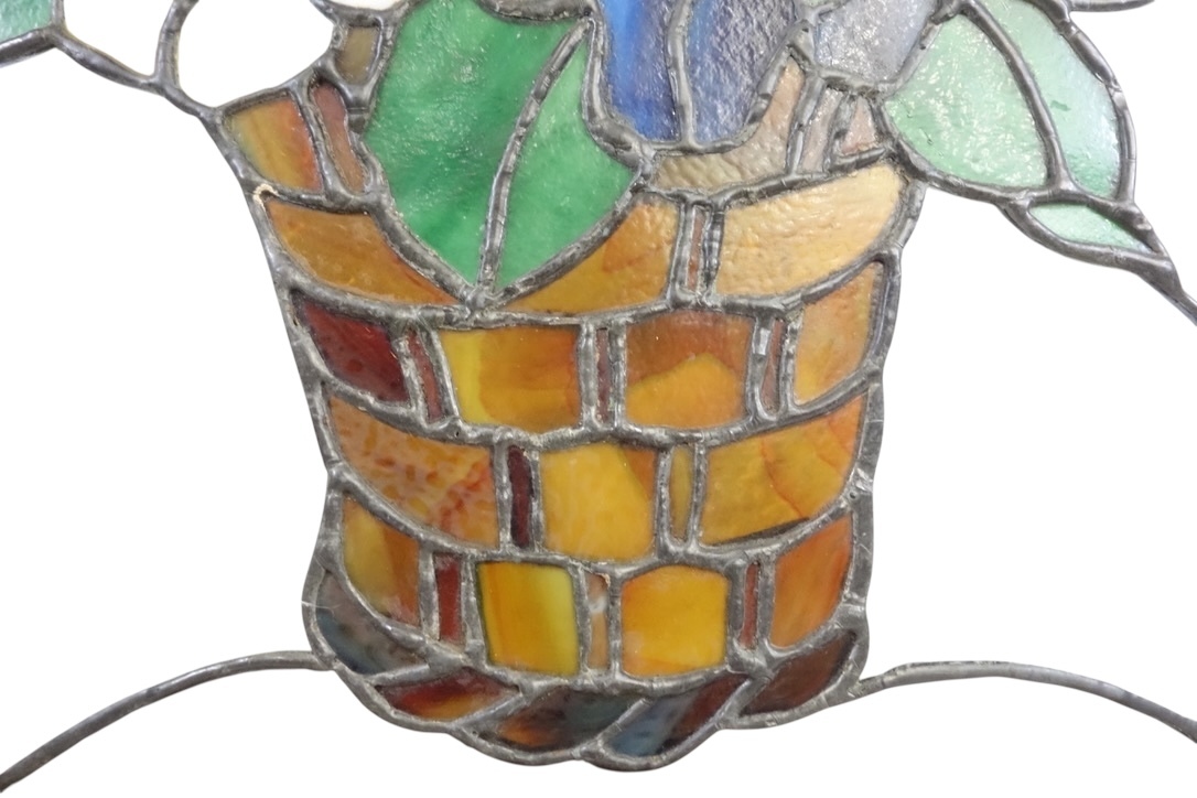 花籠に咲くアヤメやユリを思わせる華やかな花々が、色とりどりのガラスで表現されているステンドグラスです。
