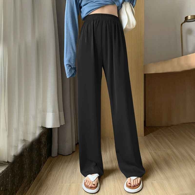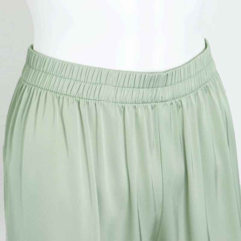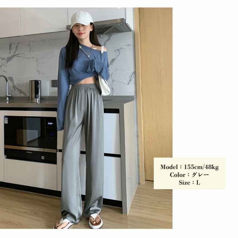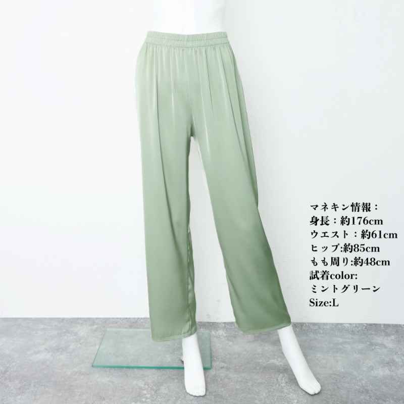 微光沢があり、ドレープ感のある滑らかな素材を使用したセミワイドパンツ。