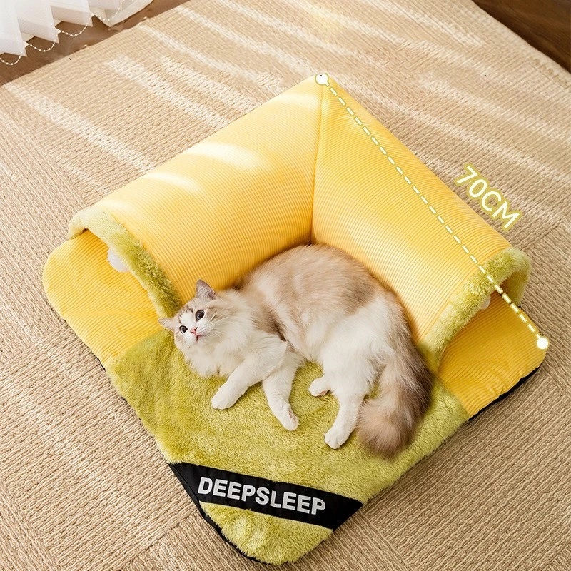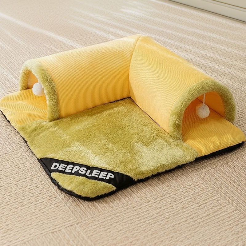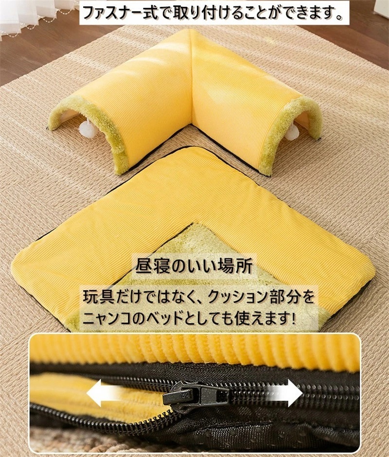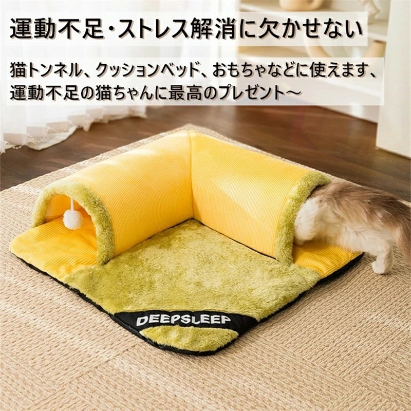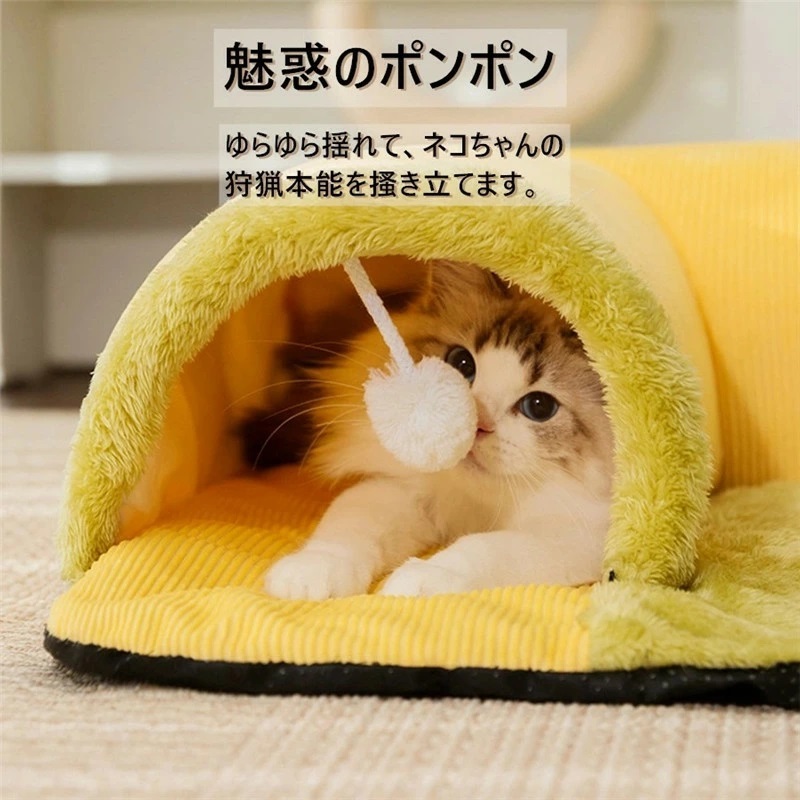 Y513-L 黄色 ペットベッド ネコの寝袋 猫遊び 猫用おもちゃ 2in1猫ベッドとキャットトンネルおもちゃ ポンポン付き 取り外し可能 洗える