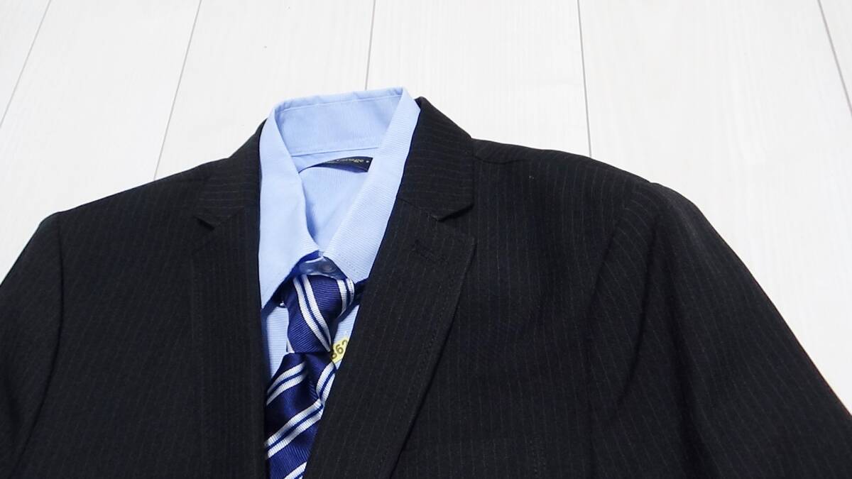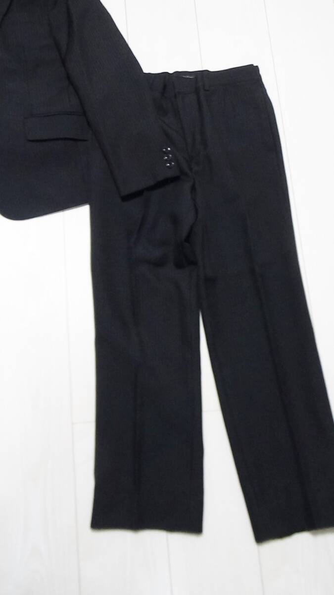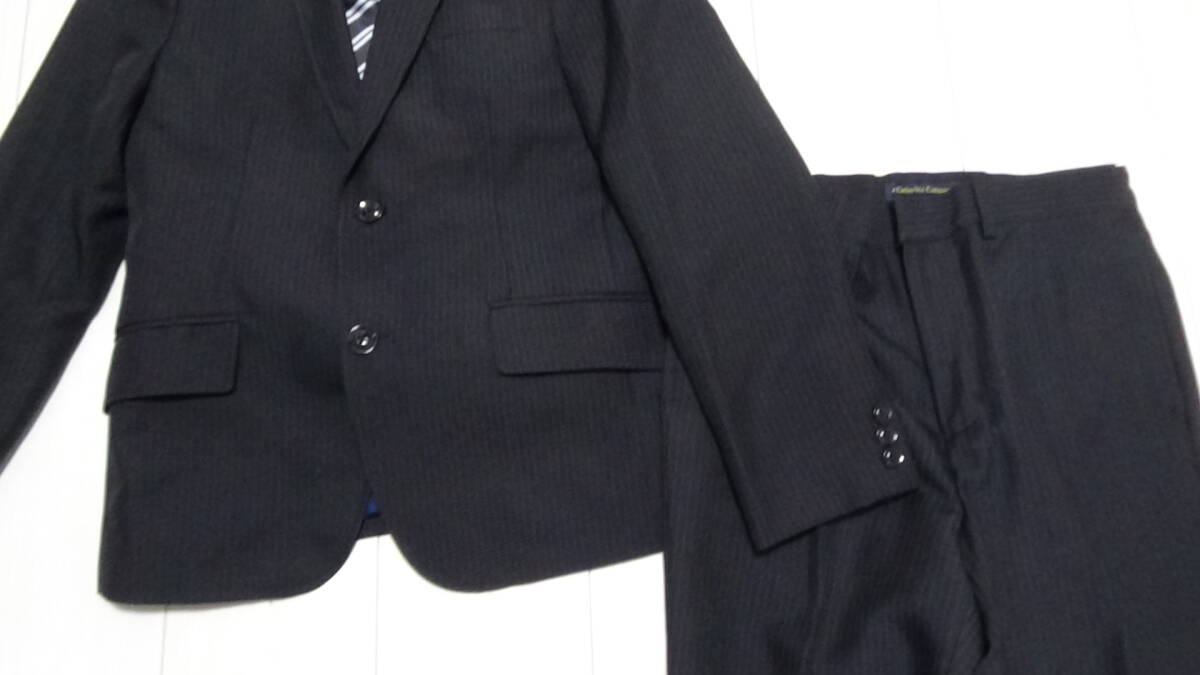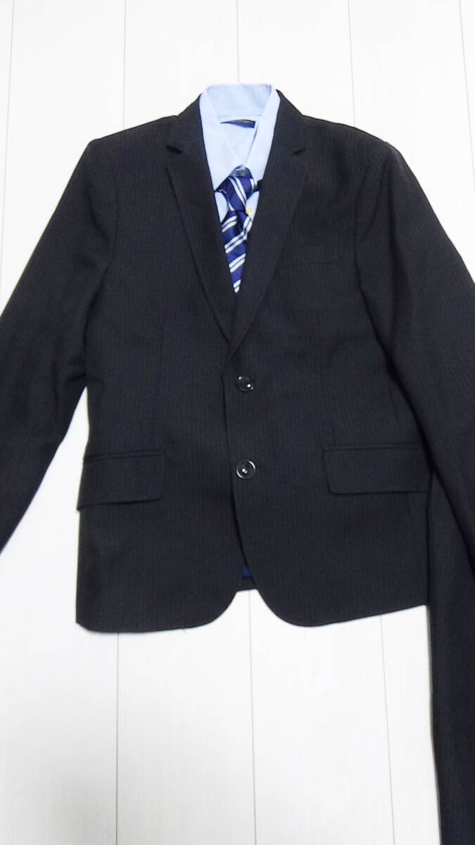 キャサリンコテージの品、ジャケット、パンツ、ネクタイ、チーフ、シャツ、2回着用の中古品です(クリーニング済み)。サイズ表記は150で、ポリエステル95+レーヨン5、地の色は黒に薄いストライプ、裏地あり、パンツはウエスト調整可能。丈を裾上げテープで上げていますので、そのまま発送します(現状の股下は62センチ)。サイズが合わなければはがしてご利用ください。ペットなし、たばこなしで着用に難のある汚れ・破れはありませんが素人の中古品につき細かい見落としはご容赦いただき、ノークレームノーリターンにてお願いいたします。他にも出品です。