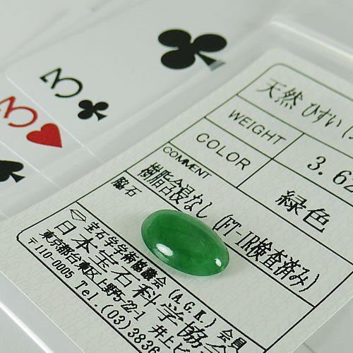 | 品名 /【SJ】新品 ヒスイ(ジェイダイト) 3.62ct ジュエリールース 材質 / 天然ヒスイ(ジェイダイト) 縦・横 / (約)13.5mm 8.6mm 厚さ / (約)3.7mm 総重量 / 3.62ct 日宝協ソーティング付き 【SJ】/ 新品製品 品番 / ACD670 参考小売価格 / 308,000円 |