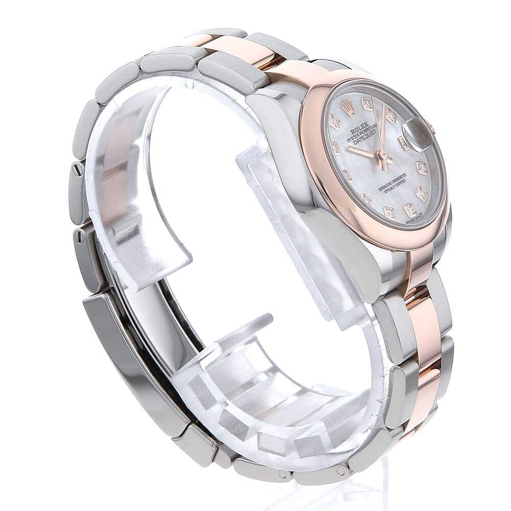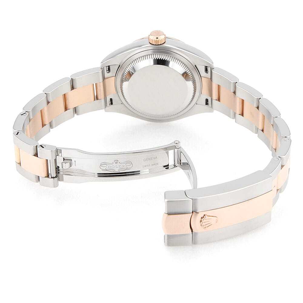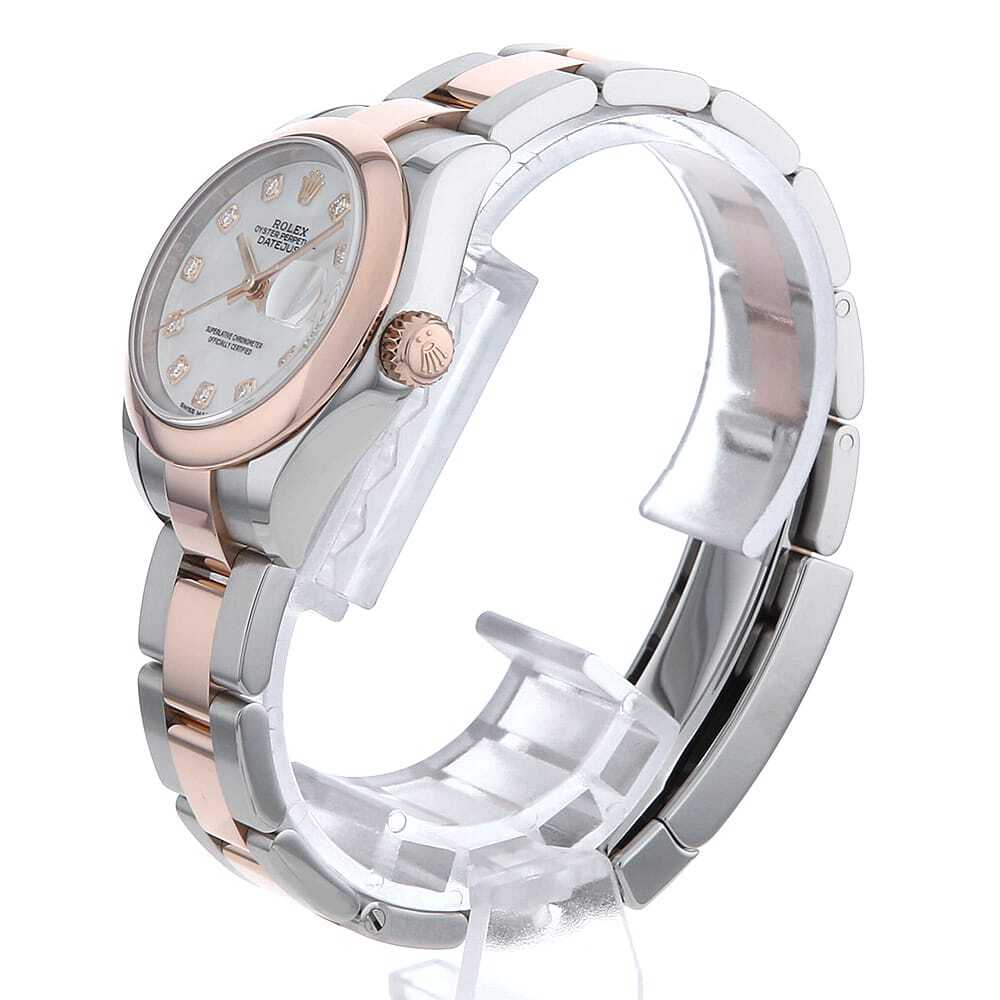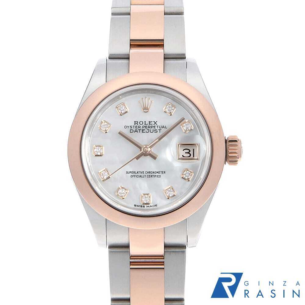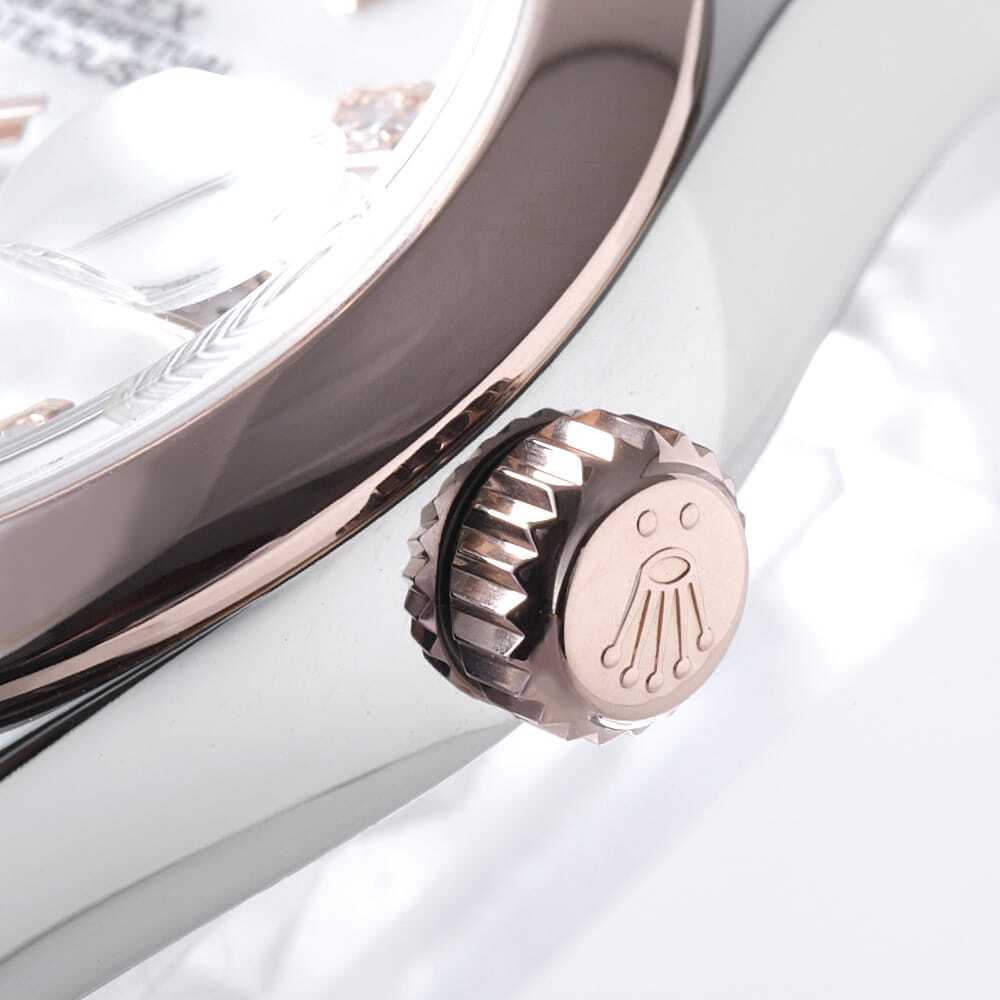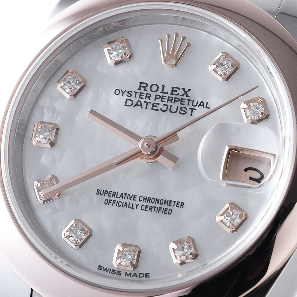 | モデル情報 | 1945年に誕生し、今やロレックスの顔とも言える"デイトジャスト"は、金属塊から削り出した防水性の高いオイスターケース、午前0時頃瞬時に日付けが変わるデイトジャスト機構、全回転式ローターを搭載したパーペチュアル機構と、ロレックス三大機構を搭載したモデルです。見る角度によって美しく表情を変えるシェルダイアル上には10粒のダイヤモンドが配され、輝きの相乗効果で高級感溢れる華やかな仕上がりへ。28mmのケースが手元をかわいらしく上品な雰囲気を演出してくれます。 |