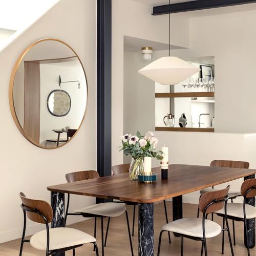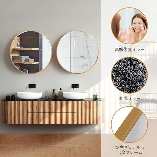 【心を込めるデザイン】高精細フロートガラスで仕上げたため、鏡面の透明度が高くて、派手なお姿や綺麗な室内レイアウトがはっきり映れます。丸い鏡の裏は鉛と銅を含まないアルミフレーム素材を使用し、バスルームのような湿度の高い環境でも使用できます。