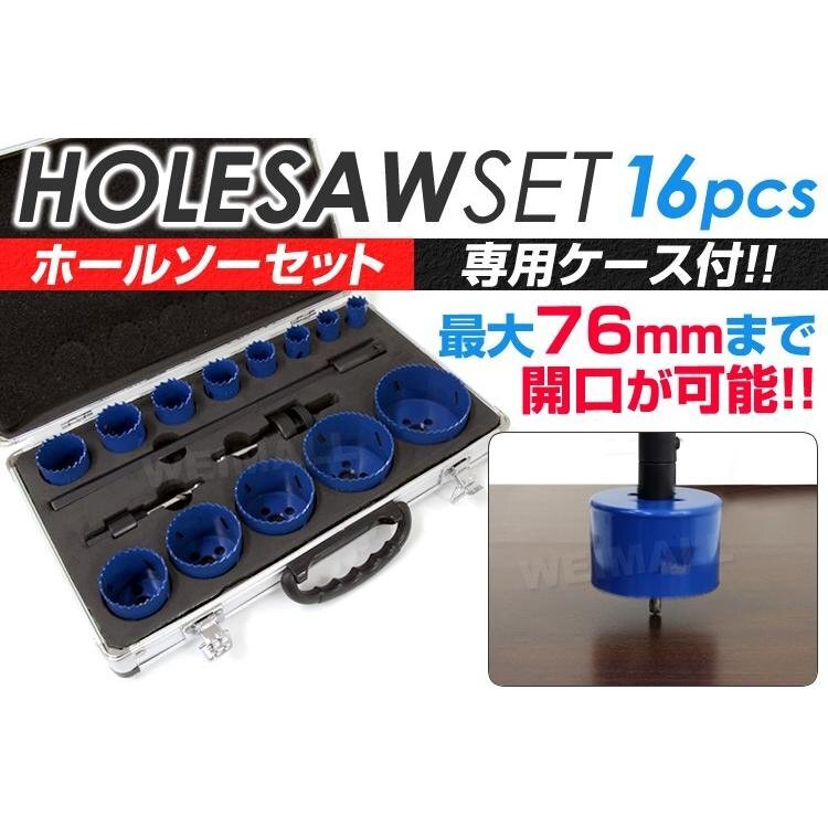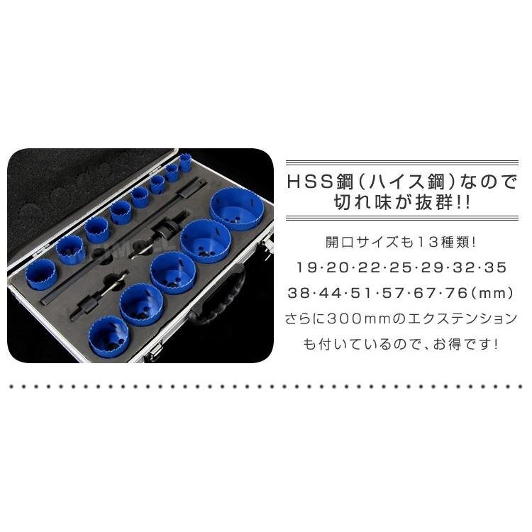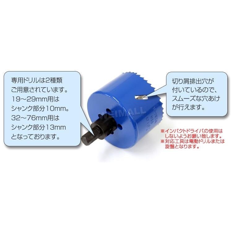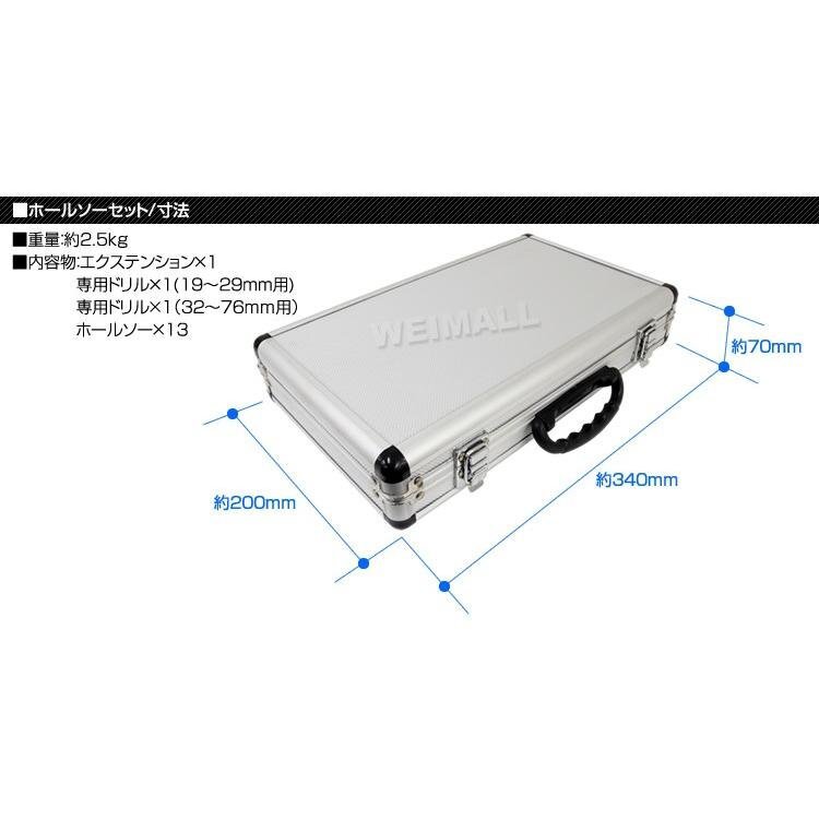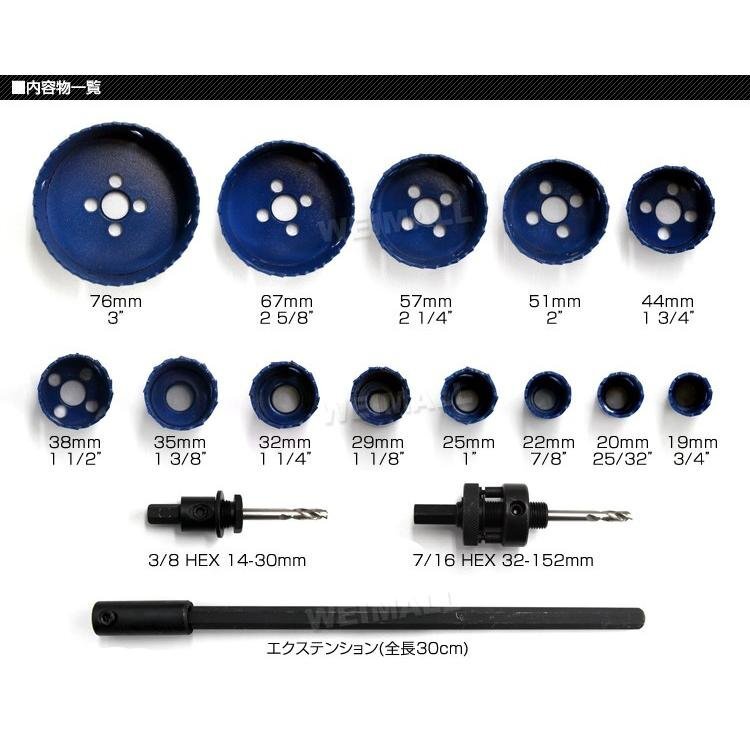 | 日曜大工で大活躍間違い無しのホールソーセットです。 鉄板やアルミニウムのほか、木材等に穴を開ける際に重宝します。 13種類のホールソーが付属されているので、用途に合わせて選ぶことができます。 お手持ちのドリルなどで使用頂けます。 専用ケース付きで持ち運び・保管に便利! 【商品仕様】 用途:3mm以下の鉄板・アルミ・塩ビ・プラスチック・木材などの穴あけに ホールソーサイズ:19・20・22・25・29・32・35・38・44・51・57・67・76mm 材質:HSS鋼(ハイス鋼) 重量(約):2.5kg 【商品内容】 ホールソー ×13 専用ドリル(19~29mm用)×1 専用ドリル(32~76mm用)×1 専用エクステンション(300mm)×1 (ルータービットセット トリマー ルータービット 電動ルーター 電動トリマー ルーターセット 超硬ルータービット ドリル ミニドリル 木工 工具 電動工具 作業 オプション 人気 おすすめ 安い)