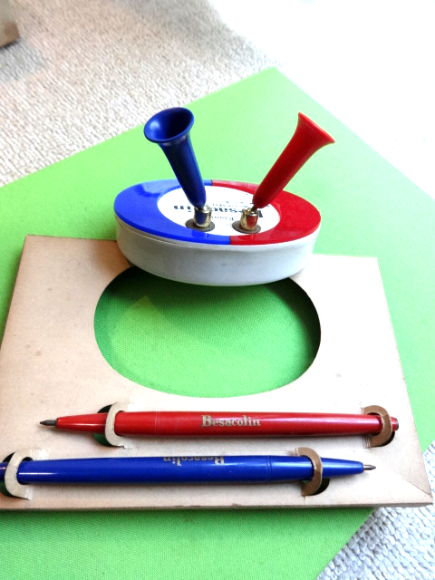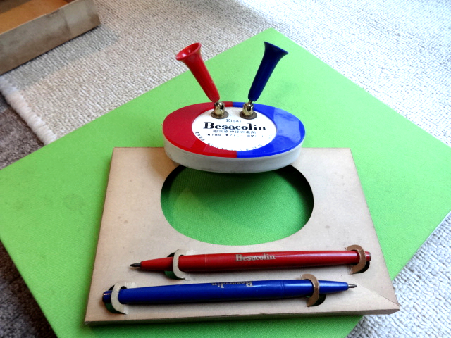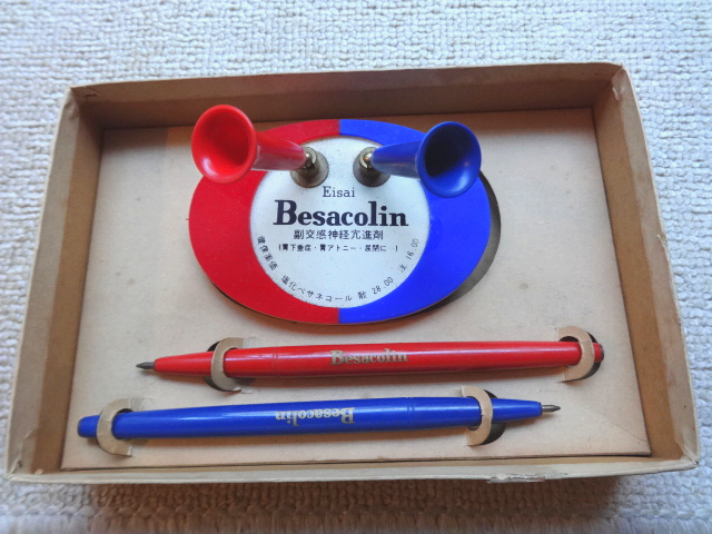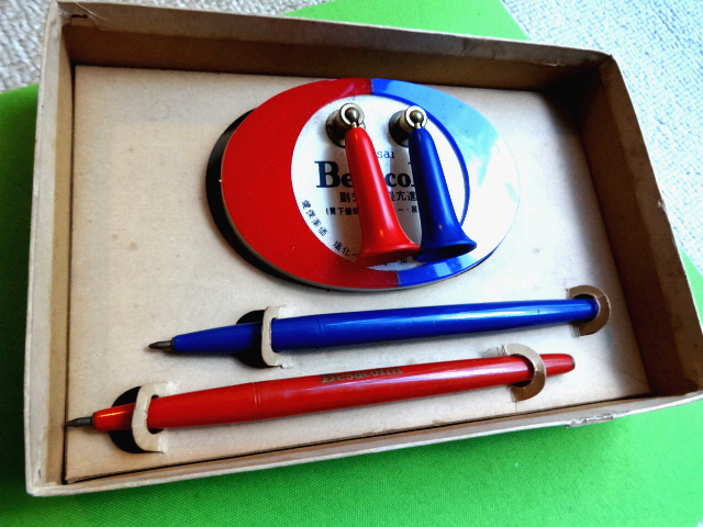昭和レトロペン ボールペンノベルティグッズ事務用品赤青ボールペンとペン立て未使用経年 保管品