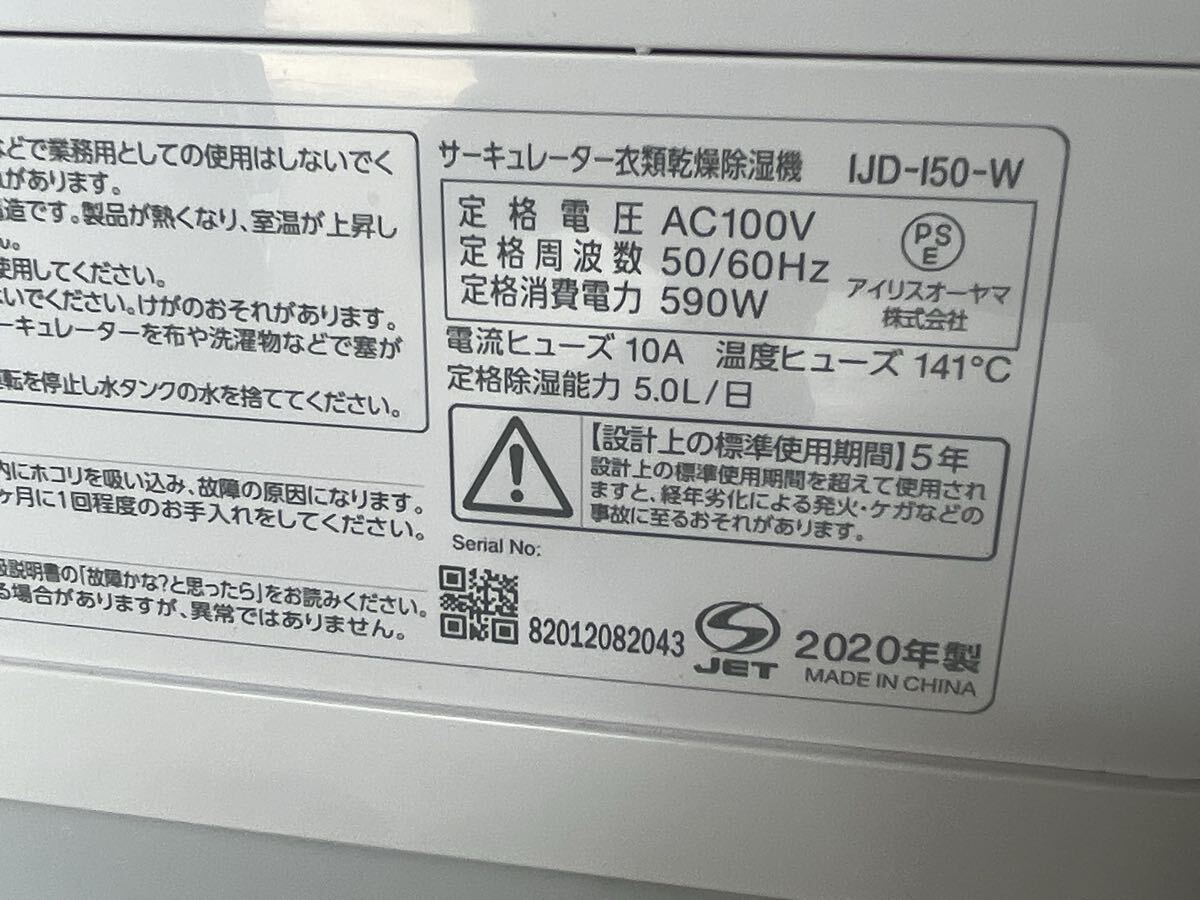 ★動作確認済み IRIS OHYAMA サーキュレーター衣類乾燥除湿機 IJD-I50-W ホワイト デシカント式 タンク容量2.5L 中古品 管理O260