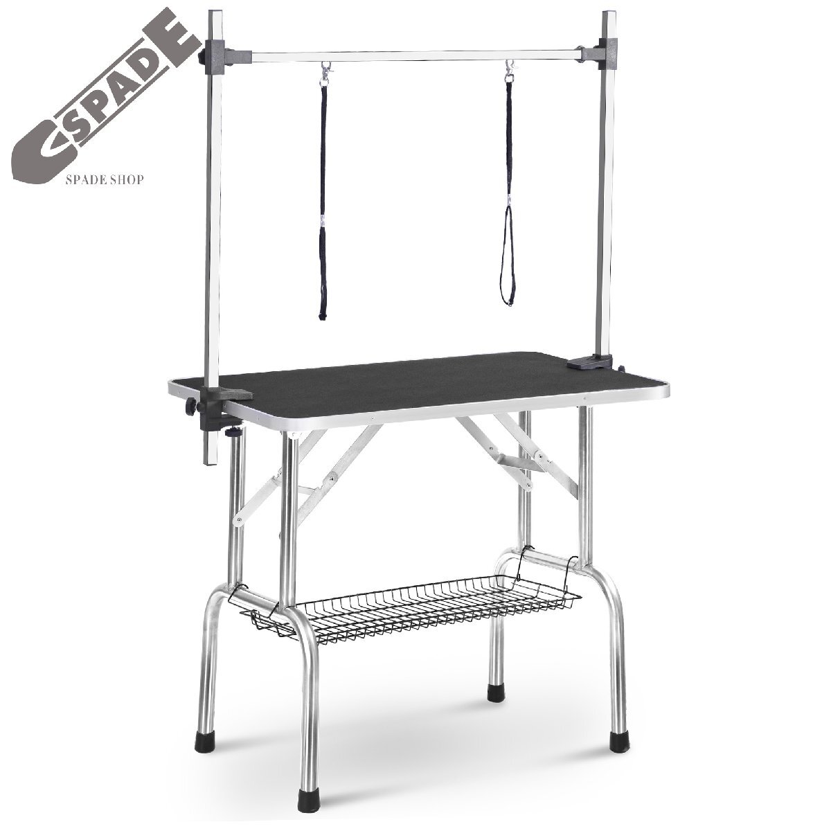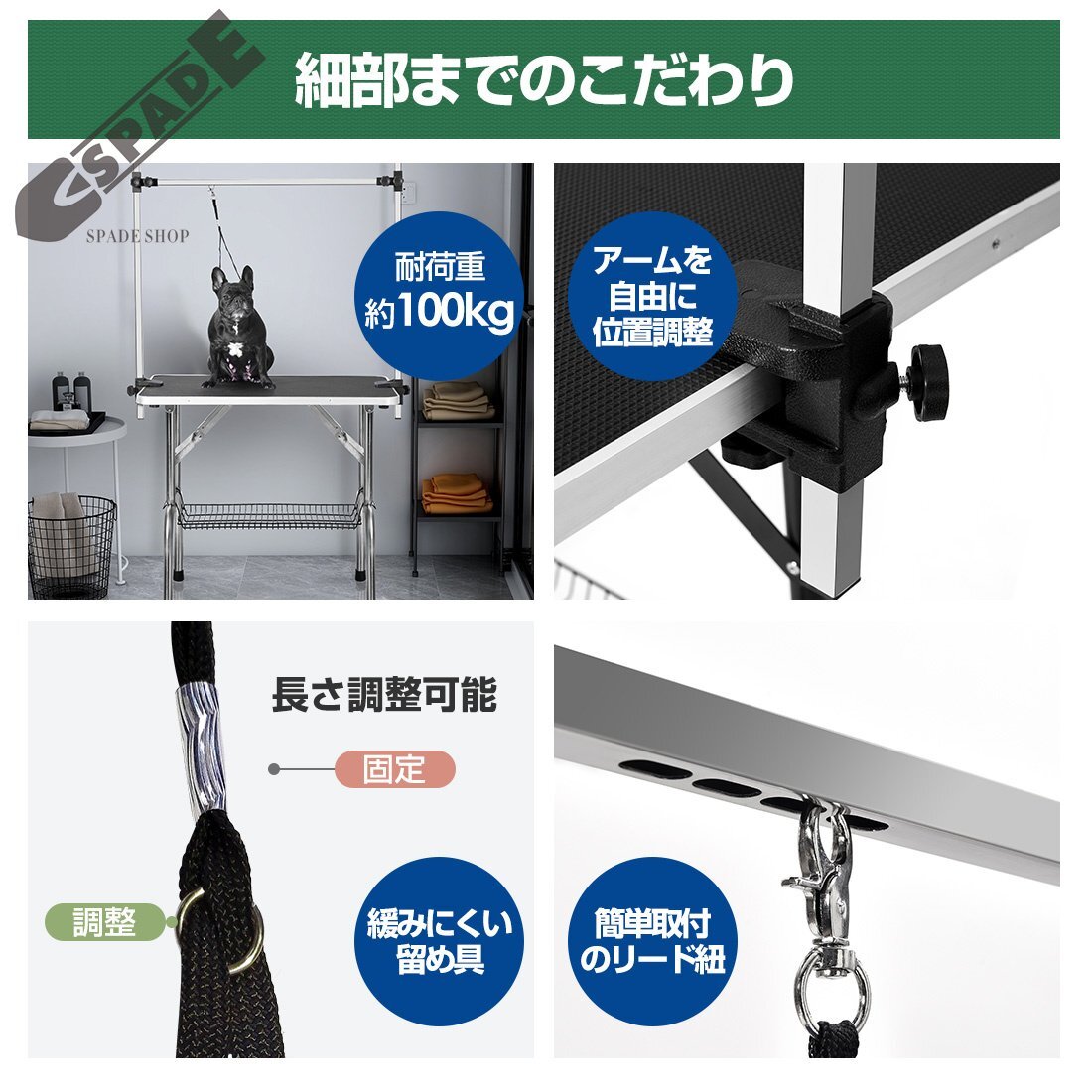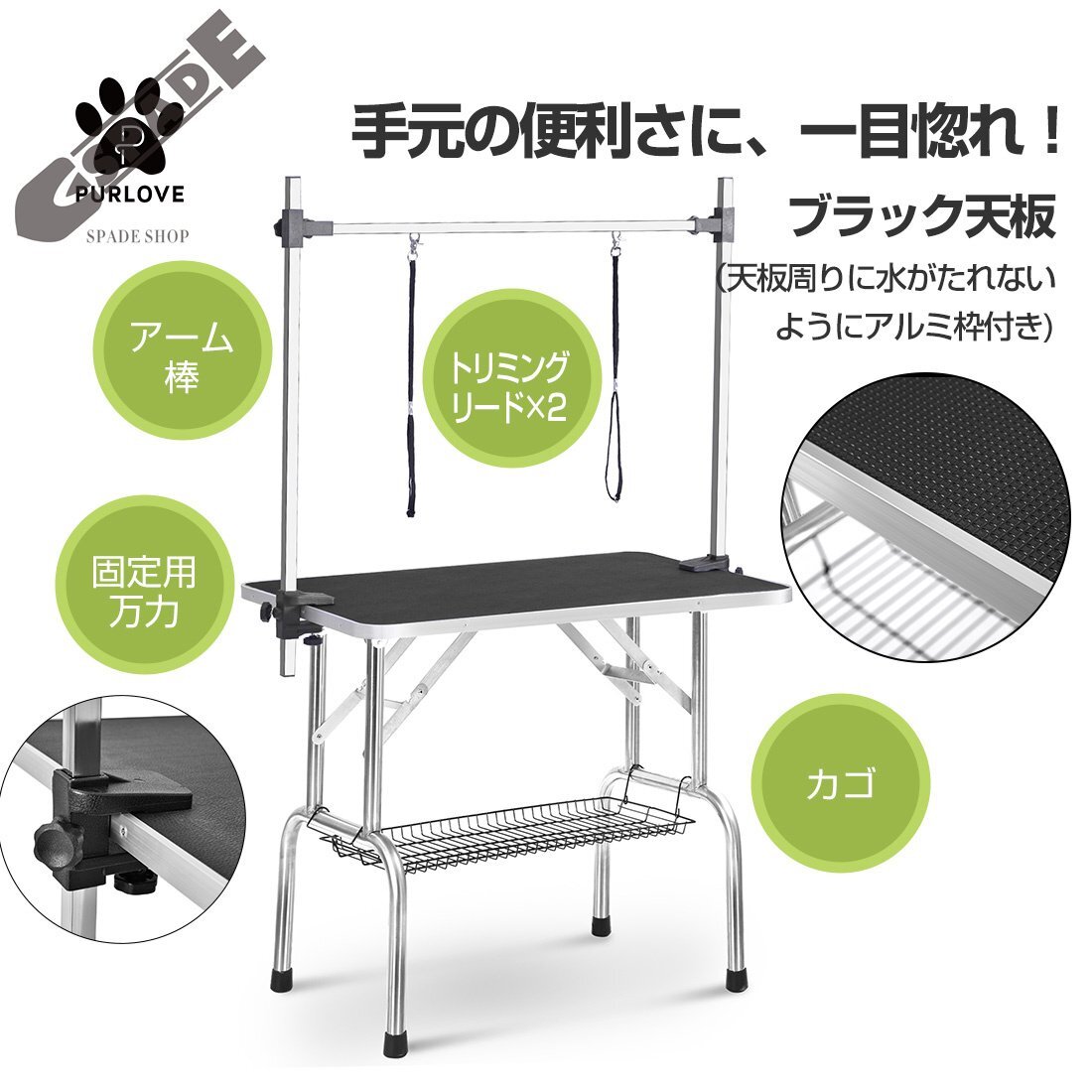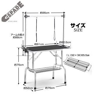 ◆ アームの高さが無段階調整 高さ88cmのアームは自由に高さを調整できるので、ペットの大きさに合せて柔軟に変えることができます。 ゴールキーパースタイルのアームがあり、垂直方向と水平方向に簡単に調整して、わんちゃんに最適な位置を調整できます。 さらに、万力で固定するタイプなのでテーブルのどの位置にもアームの取り付けが可能。 ◆ 完璧な安定性と耐久性 ステンレス鋼製のアームと天板周りのアルミ枠を使用して、耐久性が優れています。頑丈なH型アームは、安定性も高いです。 ◆ 腰を痛めにくい丁度良い高さ 作業台までの高さは75cmとなっており、屈まなくて良い丁度良いサイズ。 トリミング中の足腰への負担を軽減できます。 ◆ 汚れが取り易いし、静電気を防止し、滑り難い天板。 カット時にハサミの先が引っかからないよう天板を採用しました。さらに滑りにくい材質を採用なので、安全にトリミングできます。 ◆ 折畳式でコンパクトに 折りたたみ式で使わない時は畳んでコンパクトに収納することができます。 ◆ テーブルの足元にはカゴを設置 テーブル下にはトリミング用品を置いておける便利なカゴ付き。トリミング用品を置いておけるので便利です。 ◆ 細部までのこだわり 耐荷重は約100kgと充分な強度で猫、小型犬、中型犬が使える大きさ。 万力で固定するタイプなのでテーブルのどの位置にもアームの取り付けが可能。 ワンちゃんを乾燥中テーブルから床に水がたれないようにアルミ枠付きです。 リード紐の取り付け箇所は3箇所あり、簡単に付け替えられます。 n お手入れ 1.柔らかい布でこまめにお手入れしてください。 2.掃除機や専用のブラシをご使用いただき、お手入れしてください。 3.さびが付かないように、普段はかご、アーム棒を干してから設置してください。