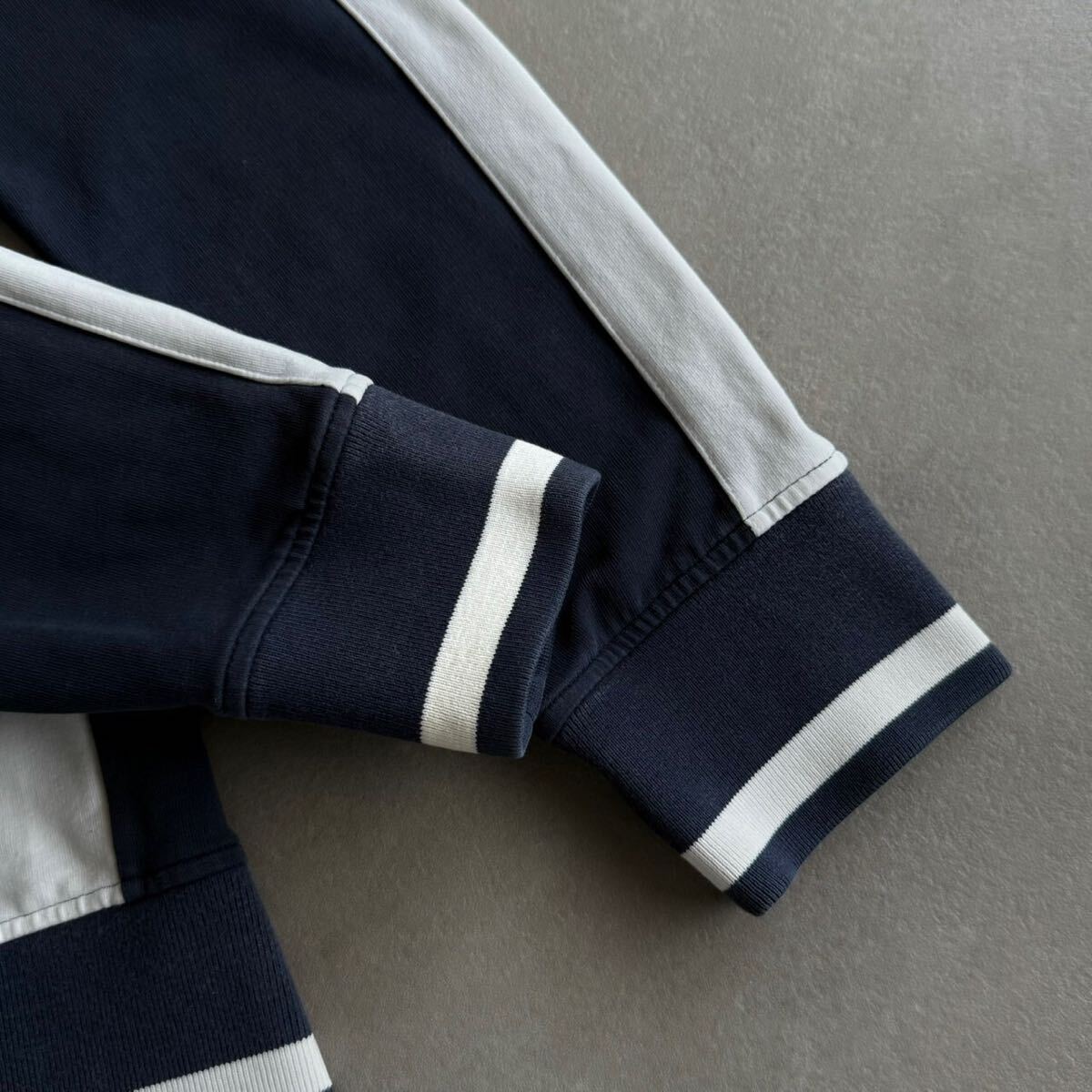 深みのあるネイビーにホワイトのサイドラインを配した洗練された配色。シンプルでありながら、立体感ある胸元の騎士ロゴ刺繍と、裾付近にさりげなく施されたブランド刺繍が、存在感を放ちながらも品格を崩しません。