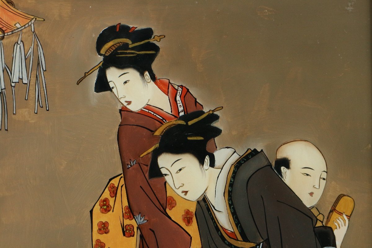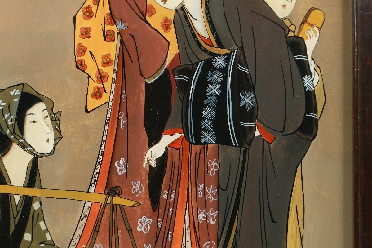 | ・時代硝子絵「鳥居清長の木版画より 風俗東之錦 盆栽売り」額装品 /壁掛け ガラス 日本 140 |