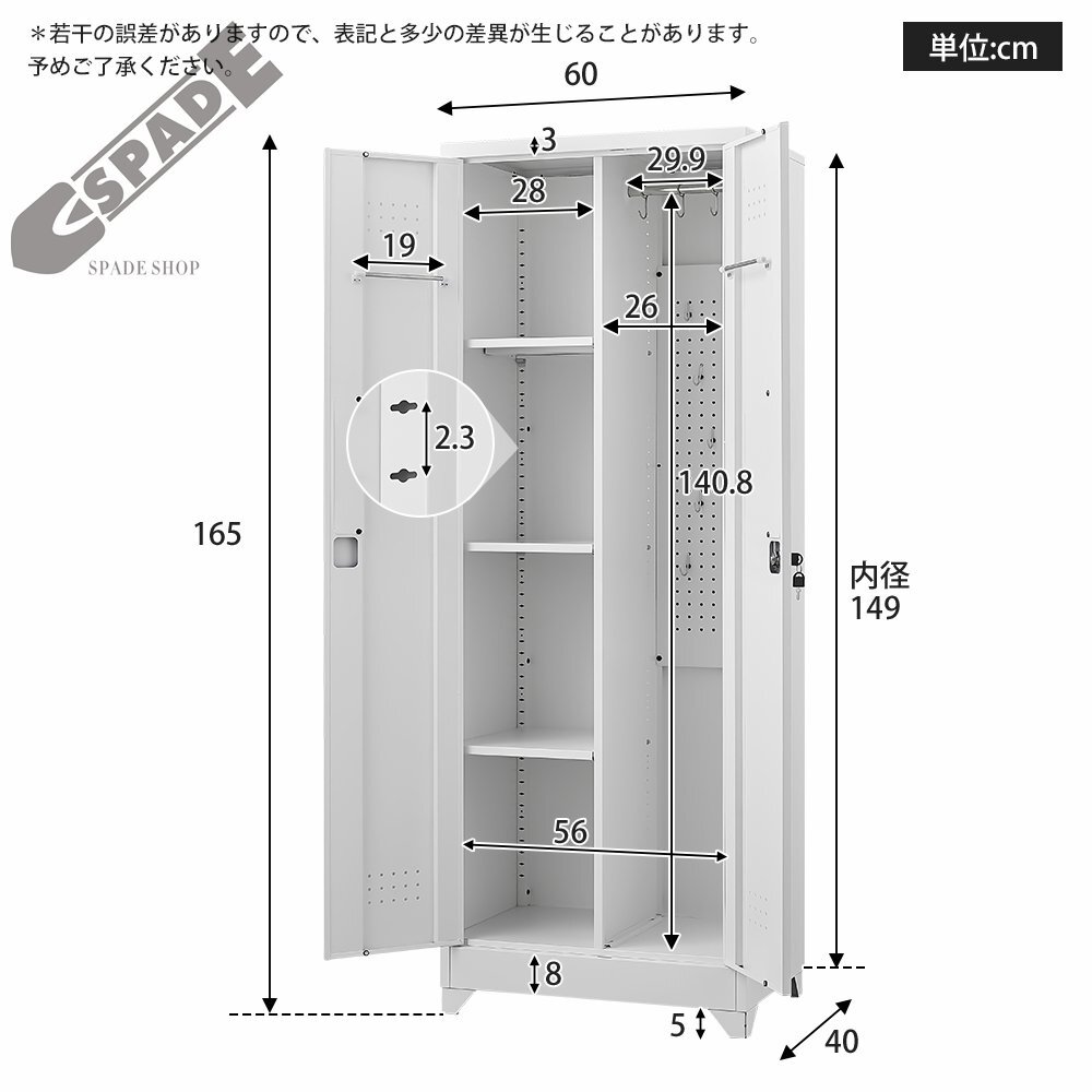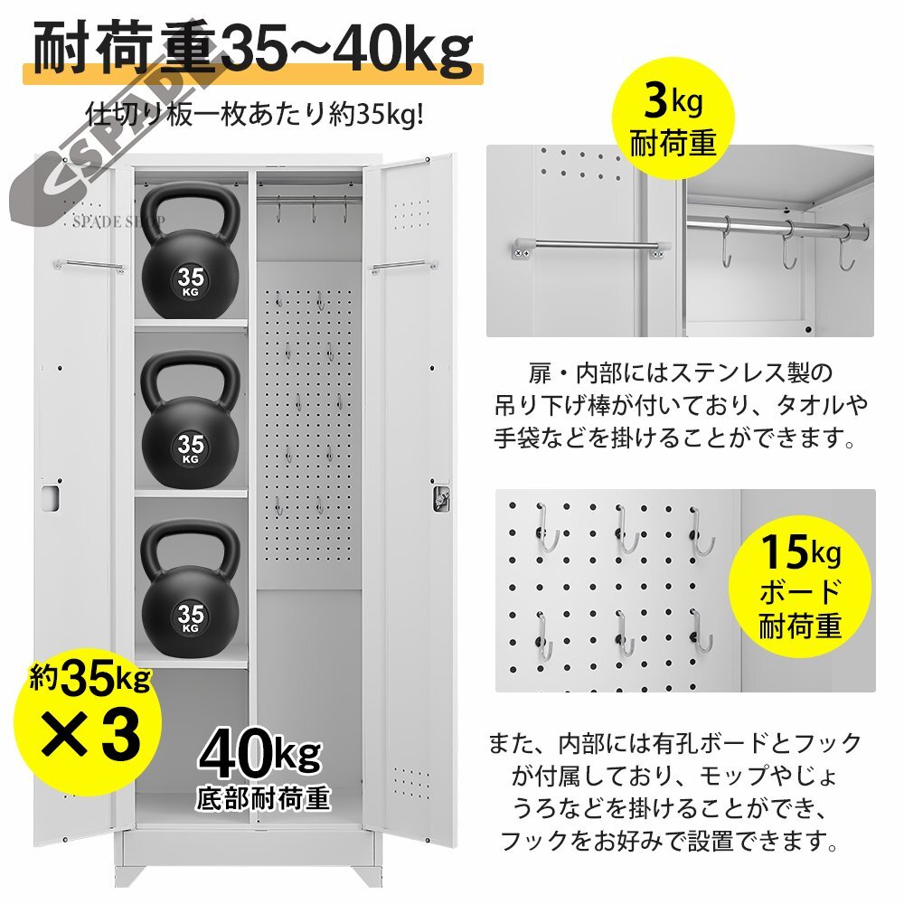 • 【可動棚】内部は物を収納するために仕切られており、物を置いたり掛けたりすることができます。仕切り板は約2.3cmごとに高さ調節可能で、物のサイズに応じて収納スペースを柔軟に調整できます。また、仕切り板を使用しない場合は、取り外すことも可能です。小物も大型の物もすっきり収納できる設計です。仕切り板一枚あたり約35kg 扉・内部にはステンレス製の吊り下げ棒が付いており、タオルや手袋などを掛けることができます。耐荷重:3kg また、内部には有孔ボードとフックが付属しており、モップやじょうろなどを掛けることができ、フックをお好みで設置できます。