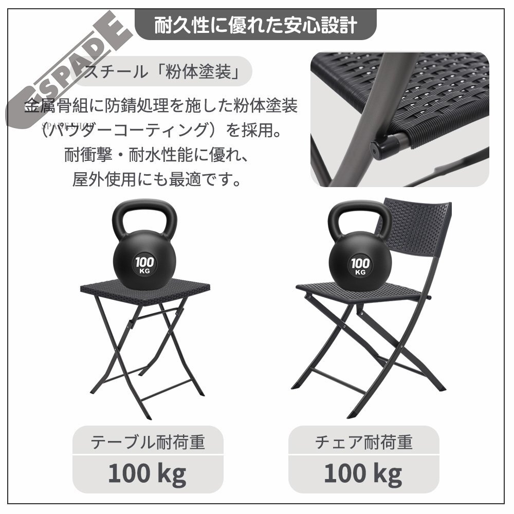 • 【耐久性に優れた安心設計】スチール「粉体塗装」金属骨組に防錆処理を施した粉体塗装(パウダーコーティング)を採用。耐衝撃・耐水性能に優れ、屋外使用にも最適です。テーブル耐荷重 100 kgチェア耐荷重 100kg