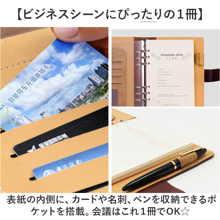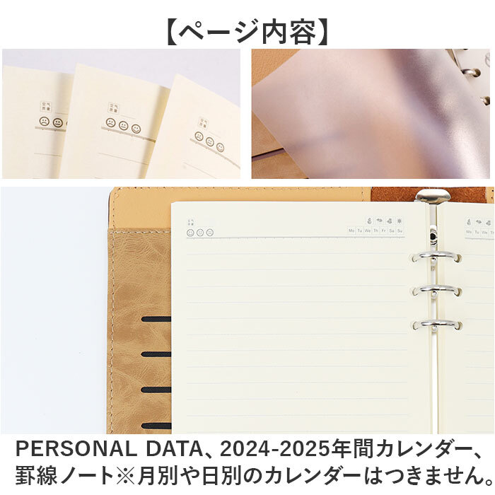 | 商品説明 | ・・【ペンやカードを収納できる◎】 ・高級感のあるシンプルデザインが嬉しい「A5システム手帳」が登場。 ・【ビジネスシーンにぴったりの1冊】 ・表紙の内側に、カードや名刺、ペンを収納できるポケットを搭載。会議はこれ1冊でOK☆ ・【追加や交換ができるバインダー仕様】 ・カレンダーリフィルなど、お好みのアイテムを自由に追加、交換をしてオリジナル手帳にできる◎ ・【全シーンに対応できるシンプルさ】 ・ビジネス、フォーマル、休日、習い事など、どんなシーンでも使えるのが嬉しいポイント。 ・【洗練された高級感を演出】 ・まるで本革のようなレザー調が魅力。高見えする素材で、ビシッと決まること間違いなし☆ ・【ちょうどよいA5サイズ!】 ・しっかり書けるのに、大きすぎない、扱いやすいA5サイズ。バッグに収納もしやすい◎ ・【パタッと閉じる、マグネットベルト】 ・持ち運び中に手帳が開かない、ベルトつき。マグネット式なので、パタッと簡単開閉。 ・【ページ内容】 ・・PERSONAL DATA、2024-2025年間カレンダー、罫線ノート ・※月別や日別のカレンダーはつきません。 ・【ポケット仕様】 ・ペンホルダー×1、カードポケット×4、窓付きポケット×1、フリーポケット×1 |