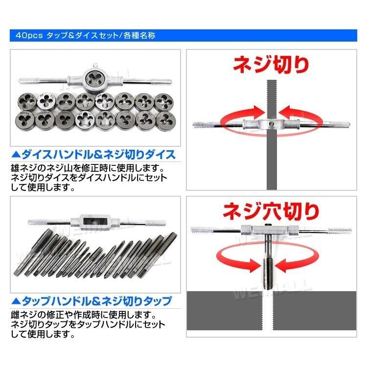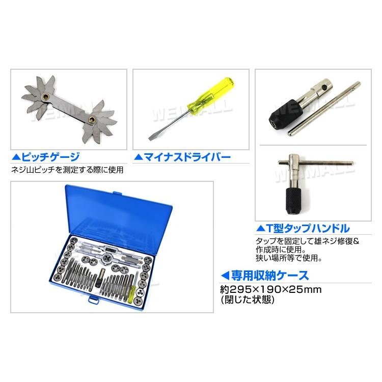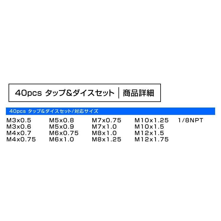 | つぶれたボルトのネジ山、ネジ穴を修復するタップダイスセットです。 車、バイクの整備から工事現場でも大活躍! ネジ山の修復、錆び落としや各種サイズのネジ山に対応! ボルト、ナットがバカになってしまった時の強い味方です。 また予めドリルで穴を開けておけば新たにネジ山を作成する事も可能です! ●商品仕様 収納サイズ(約):290×190×25mm 重量(約):1.5kg タップダイスサイズ: M3×0.5 M3×0.6 M4×0.7 M4×0.75 M5×0.8 M5×0.9 M6×0.75 M6×1.0 M7×0.75 M7×1.0 M8×1.0 M8×1.25 M10×1.25 M10×1.5 M12×1.5 M12×1.75 1/8NPT ●商品内容 タップダイス 17サイズ タップハンドル ダイスハンドル T型タップハンドル ピッチゲージ マイナスドライバー 収納ケース ●注意事項 ・入荷時期により予告無くデザインや色やサイズなど、細かな仕様が変更される場合がございます。 ・輸入品につき傷やスレなどがある場合がございます。ご了承下さい。