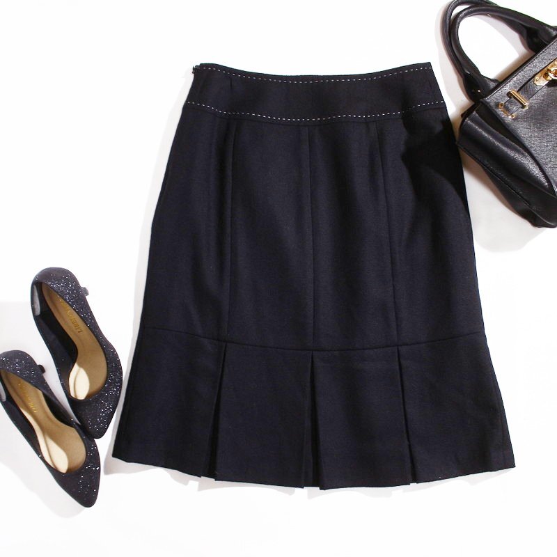 上品なブラックカラーに白いステッチがアクセントになった、洗練されたデザインのスカートです。 広がりすぎないAラインのシルエットで、裾にボックスプリーツ切替、女性らしいきれいなラインを演出します。 ウエスト部分にはステッチが施されており、トップスをインしたスタイルも決まります。 オフィスでの通勤スタイルから、ブラウスやニットと合わせたきれいめカジュアルまで、幅広いシーンで活躍する一枚です。 ウール100%あったかデザインです。