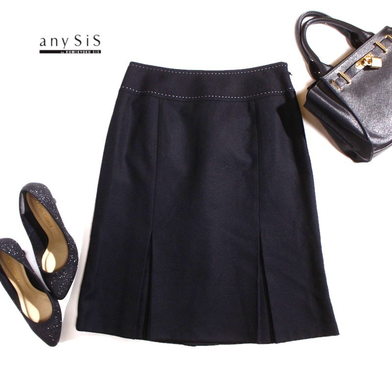 美品 any SiS エニィスィス 株) 株) ワールド 秋 冬 毛100% ホワイトステッチ フレアスカート 9号 2 ブラック 黒 ウールスカート スカート