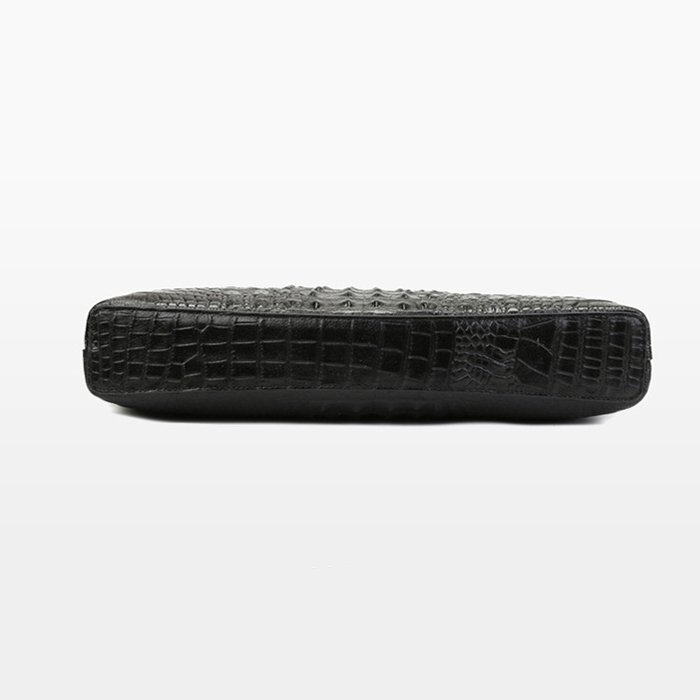 深淵の墨黒に天然皮革の紋様が流れる。クロコダイル押しの立体肌理が野心を刻み、指先が触れるごとに権威の重みを伝達。時と共に革脂が沈着し、貴族的光沢を放つ。