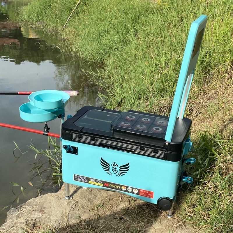 機能および付属パーツ:ハンドル、水栓、背もたれ、高さ調整可能な脚、釣りエサ箱、ショルダーベルト