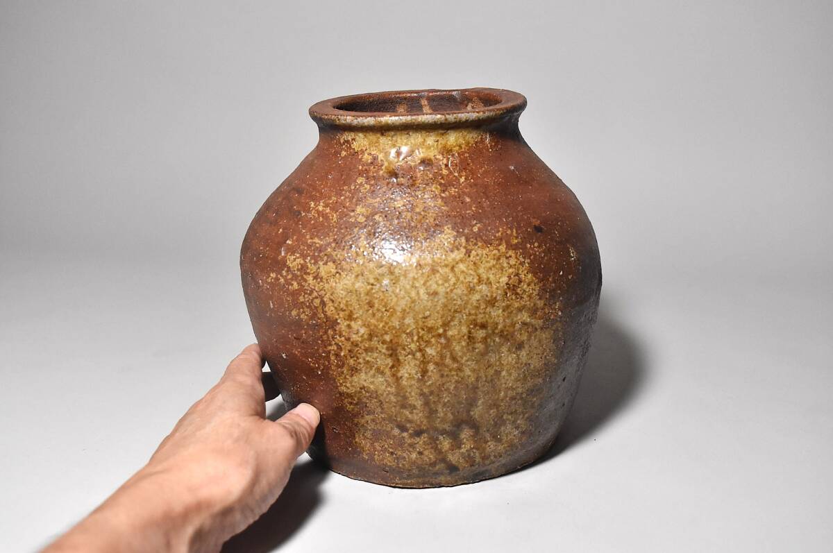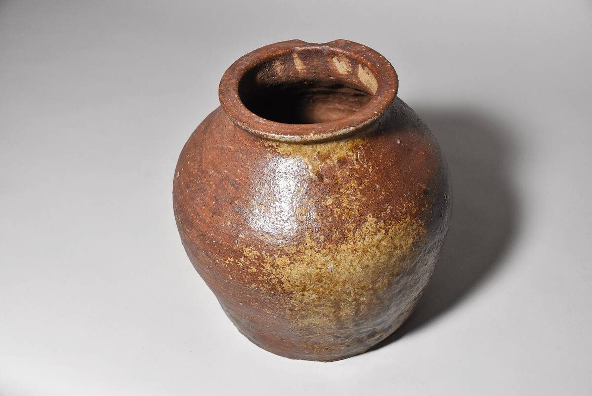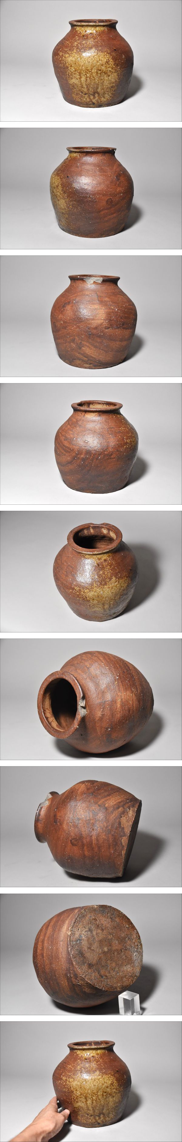 | 商品説明 | 「越前中壺(桃山~江戸時代)」です。 胴に鉄釉を、太い刷毛で粗く塗っています。 ツヤのある自然釉が、安定感のある姿形に 景色を添えています。 ダメージはご覧いただける口部の欠け程度 水も直接入ります。 どうか、よろしくお願いいたします。