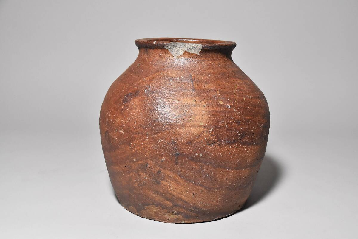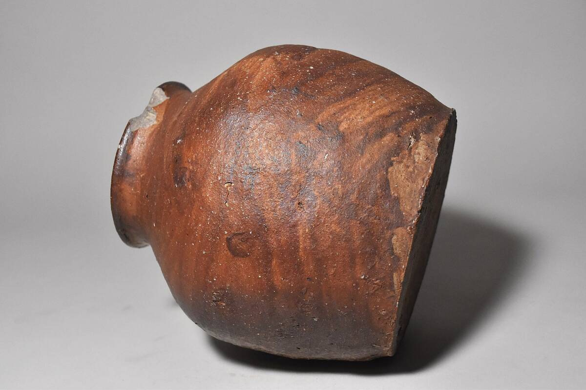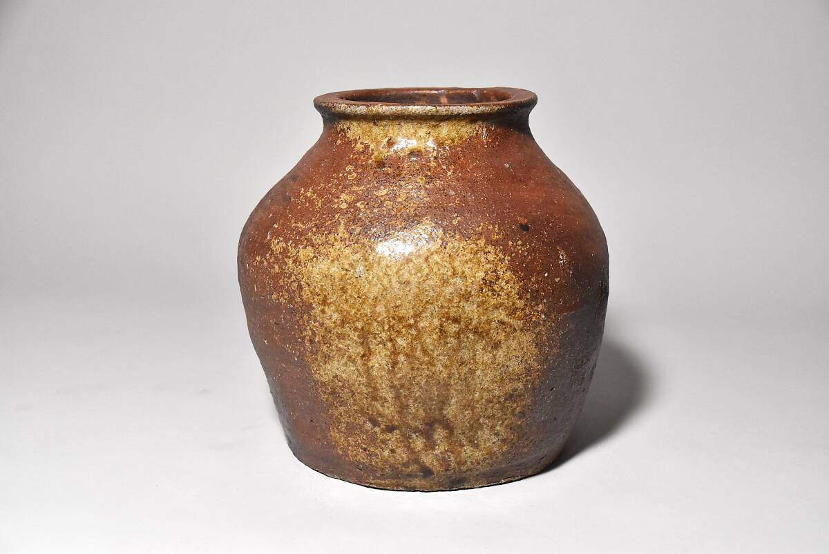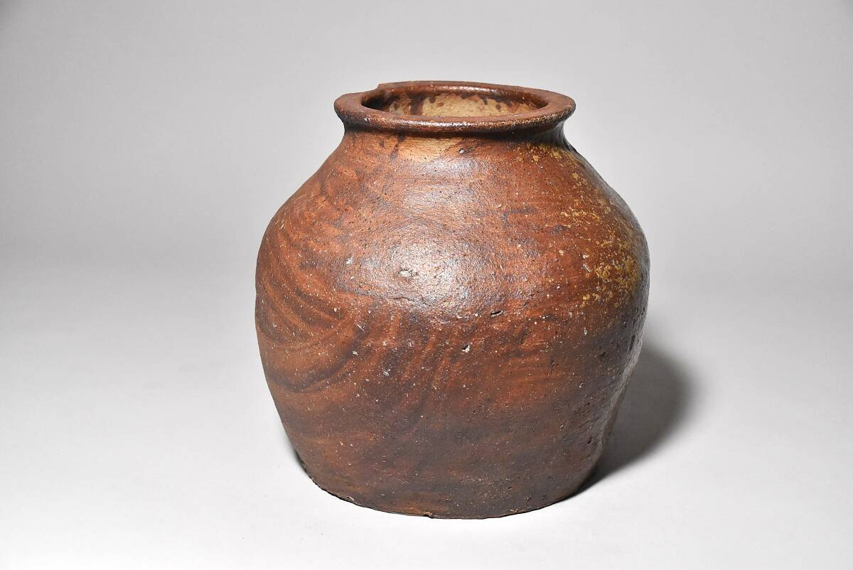 | 商品説明 | 「越前中壺(桃山~江戸時代)」です。 胴に鉄釉を、太い刷毛で粗く塗っています。 ツヤのある自然釉が、安定感のある姿形に 景色を添えています。 ダメージはご覧いただける口部の欠け程度 水も直接入ります。 どうか、よろしくお願いいたします。