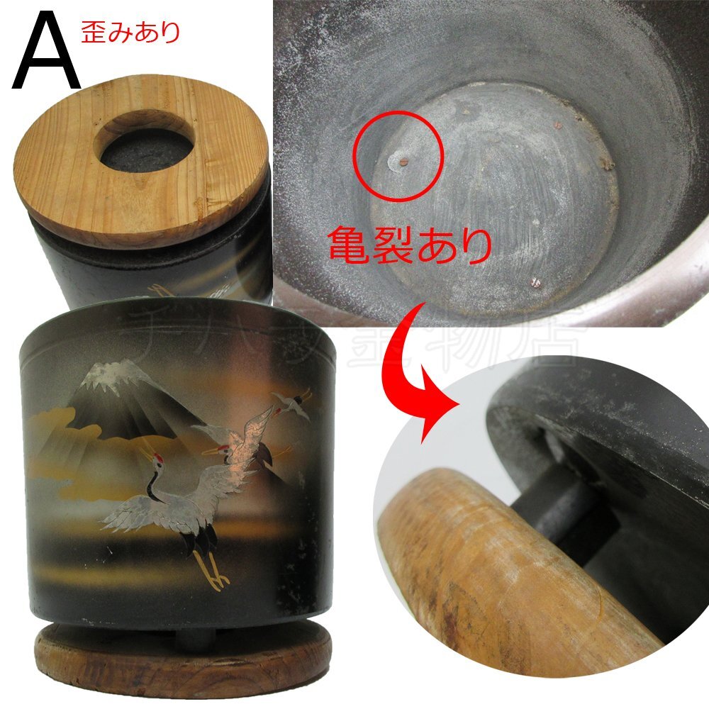 真鍮手あぶり火鉢 銅製 火鉢 直径約24cm 木製台座付 鶴、富士山図 1対 2個セット 火鉢 3本足 古民具 亀裂、傷みあり 未使用品