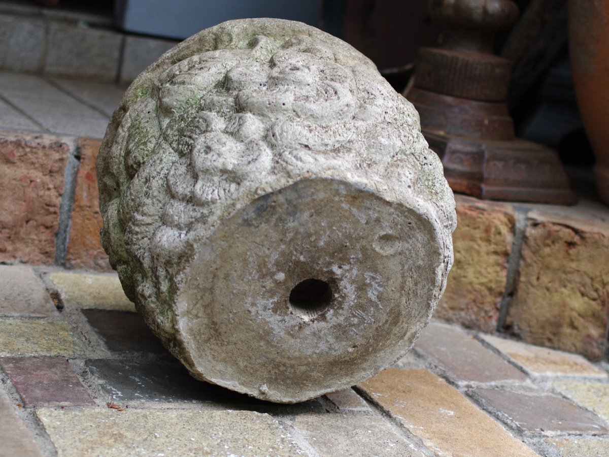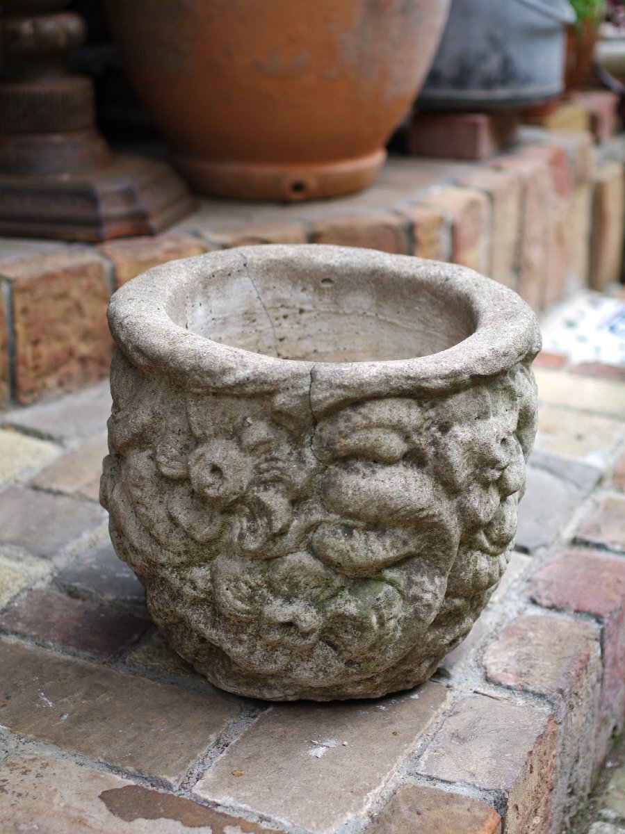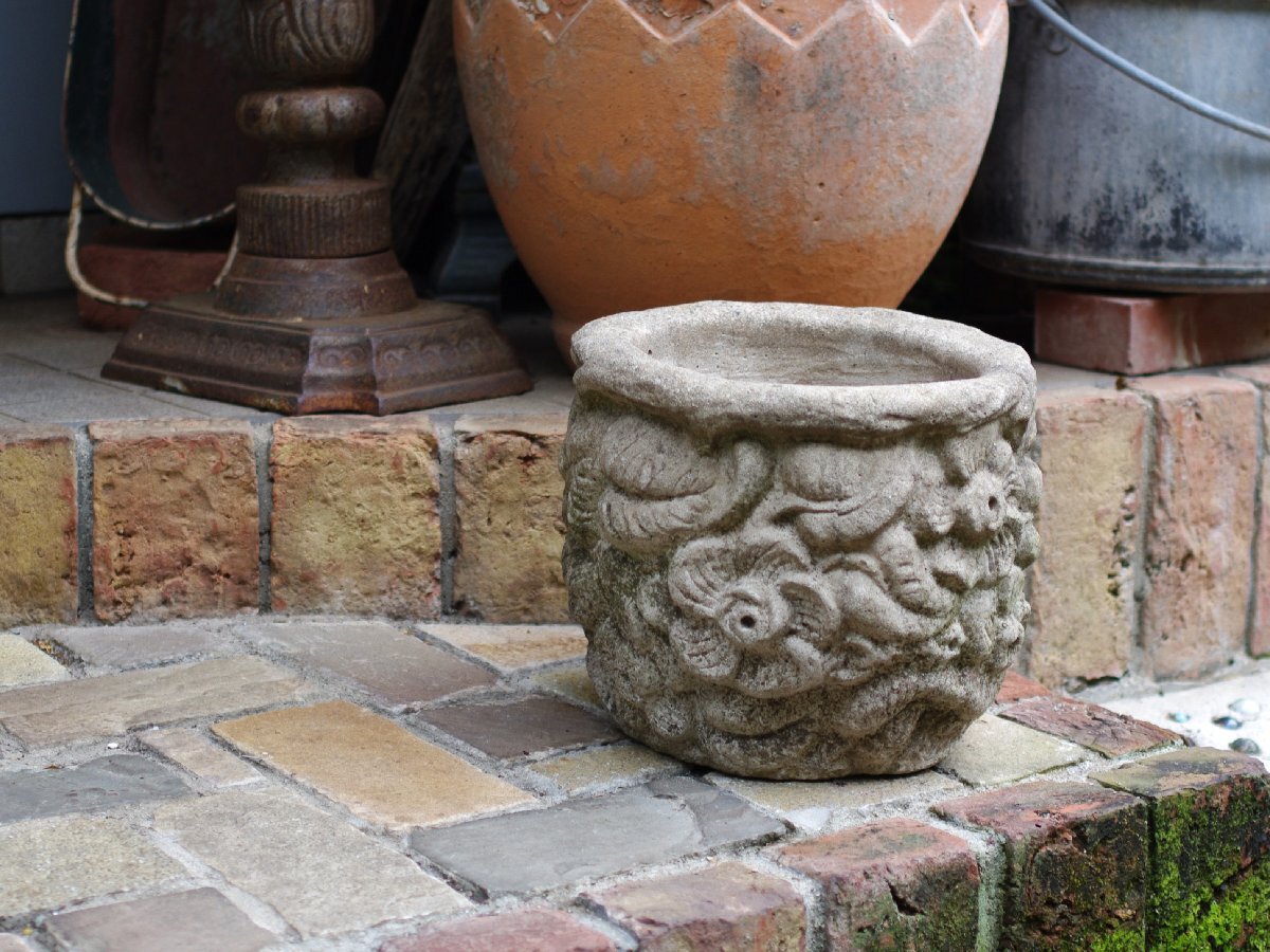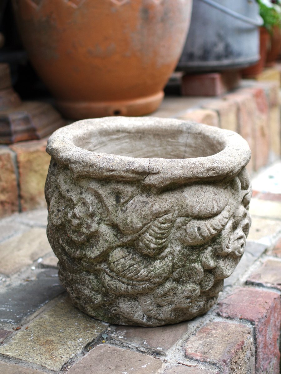 イギリスアンティークのセメント鉢【44-184-B】3か所ヒビが入っているため通常の半額にてお届けします。かなり厚みがるので、すぐに割れてしまう感じはなく存在感も素敵ですが、気になる方は購入をお控えください。