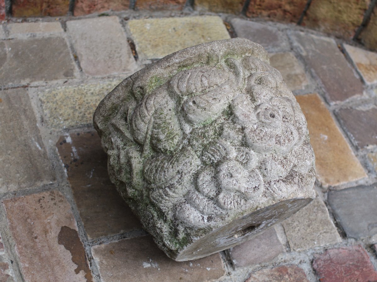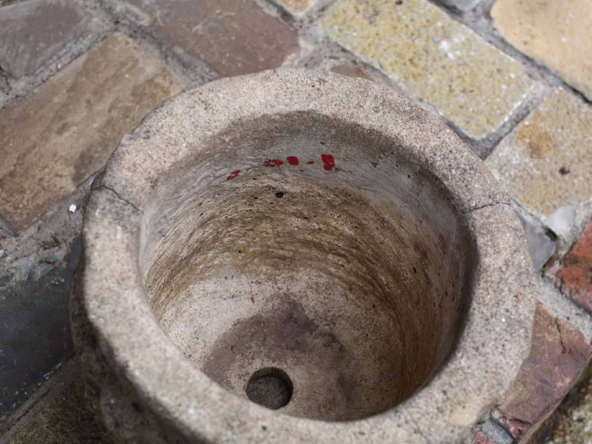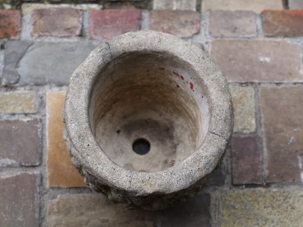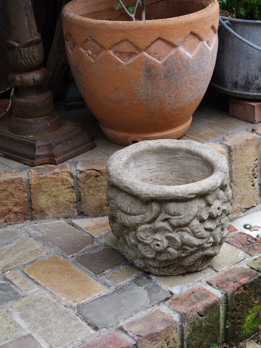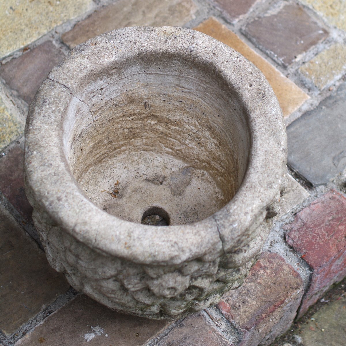 イギリスアンティークのセメント鉢【44-184-B】3か所ヒビが入っているため通常の半額にてお届けします。かなり厚みがるので、すぐに割れてしまう感じはなく存在感も素敵ですが、気になる方は購入をお控えください。