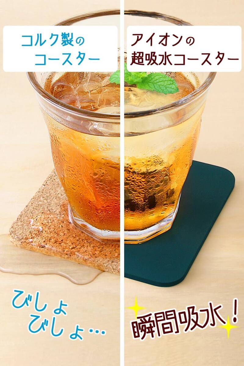 説明 ●コップに付いた水滴をグングン吸収する、柔らかな超吸水コースターです。 ●コップの裏についた水滴や、しずくをまたたく間に吸収します。 ●絞れば吸水力が復活し、何度でもすぐに使用する事が出来ます。 ●柔らかくクッション性があるため、落としても割れず、コップを置くときに音が鳴りません。 ●表と裏、両面使用する事が出来ます。 ●耐熱温度100℃。温かいお飲み物でもお使いいただけます。