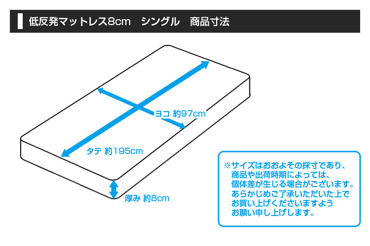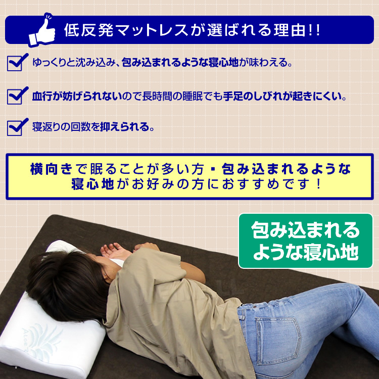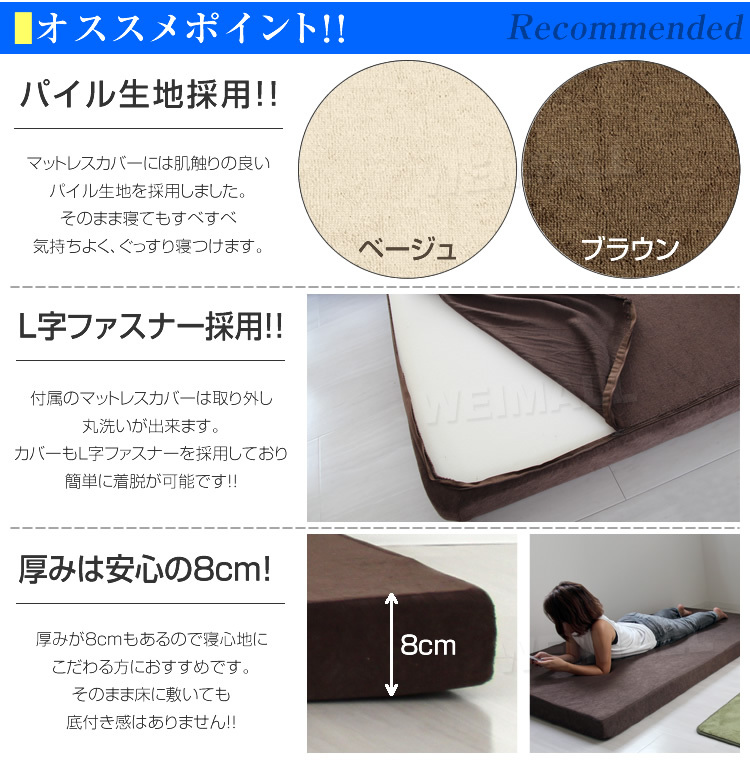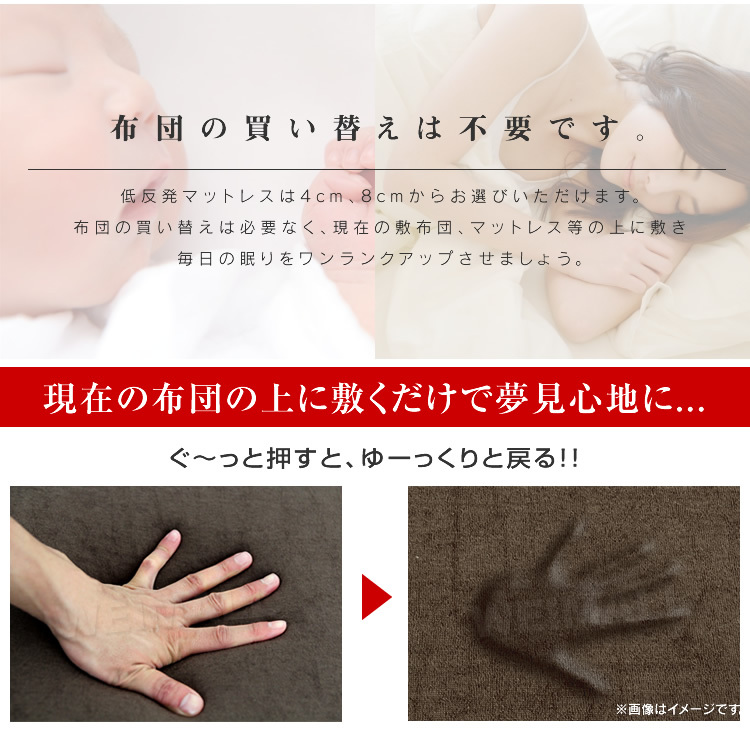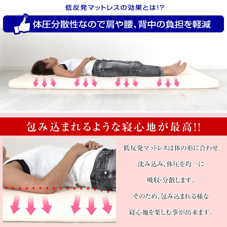 | 一枚取り入れるだけで、じんわりやわらかな夢の寝心地を実現する低反発マットレスです♪ 厚みが8cmあるので、そのまま敷いてもOK!マットレスや敷き布団の上に敷けばOK! 底付き感がなく快適におやすみいただけます。 取り外しやすいL字ファスナー付き洗えるカバーが付属しています! 【商品仕様】 カラー:ベージュ サイズ(約):幅97cm×長さ195cm×厚み8cm(シングルサイズ) 梱包サイズ(約):(約)54.3×30×30cm 重量(約):(約)6.4kg 素材:低反発ウレタン(密度40kg/m3) 、パイル生地 他 ※耐熱仕様ではございませんので、電気毛布との併用はおやめください。 (マットレス シングル セミダブル ダブル 高反発 低反発 高反発マットレス 低反発マットレス 4cm 8cm 10cm シングル 高反発マット 低反発マット マット ベットマット ベッド 敷き布団 洗える カバー 寝具 人気 おすすめ) |