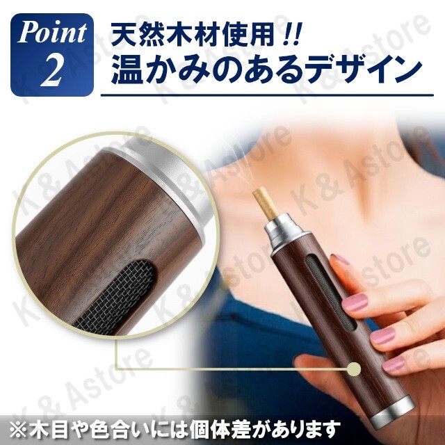 実際に木材を使用することでぬくもりのあるデザインがおしゃれです。筒状のシリンダー型でポケットやバッグにもすっきりと収まるスリム設計で、持ち運びにも便利です。