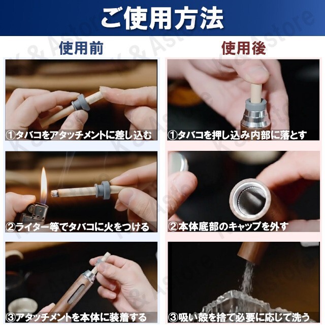 これまでの携帯灰皿のように吸い殻を中に入れるだけでなく、タバコをセットしてそのまま吸うことができます。喫煙中に灰を気にせず、スマートに一服を楽しめます。