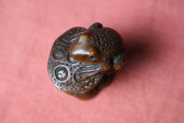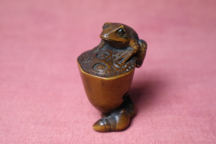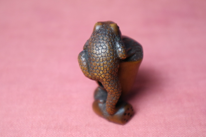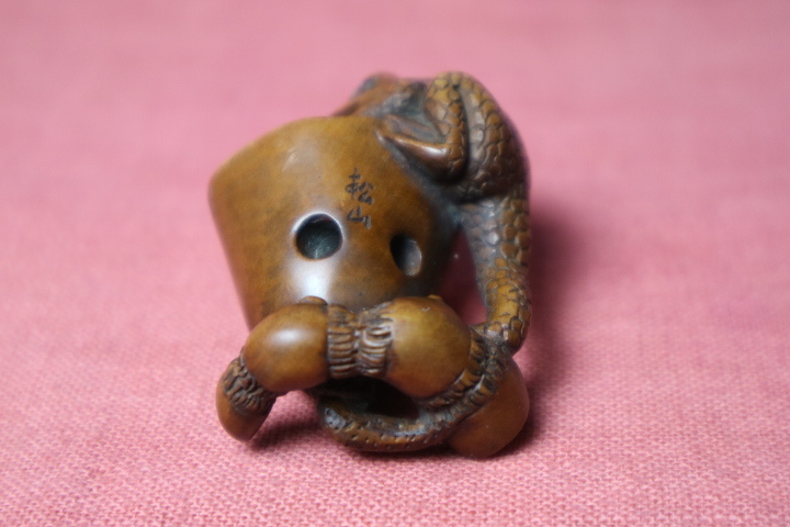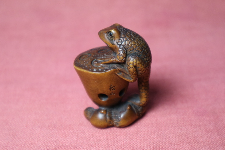 蓮に蛙がよじ登っています。面白い図柄の根付です。彫の良い品です。作家物で紐通し近くに銘あります。