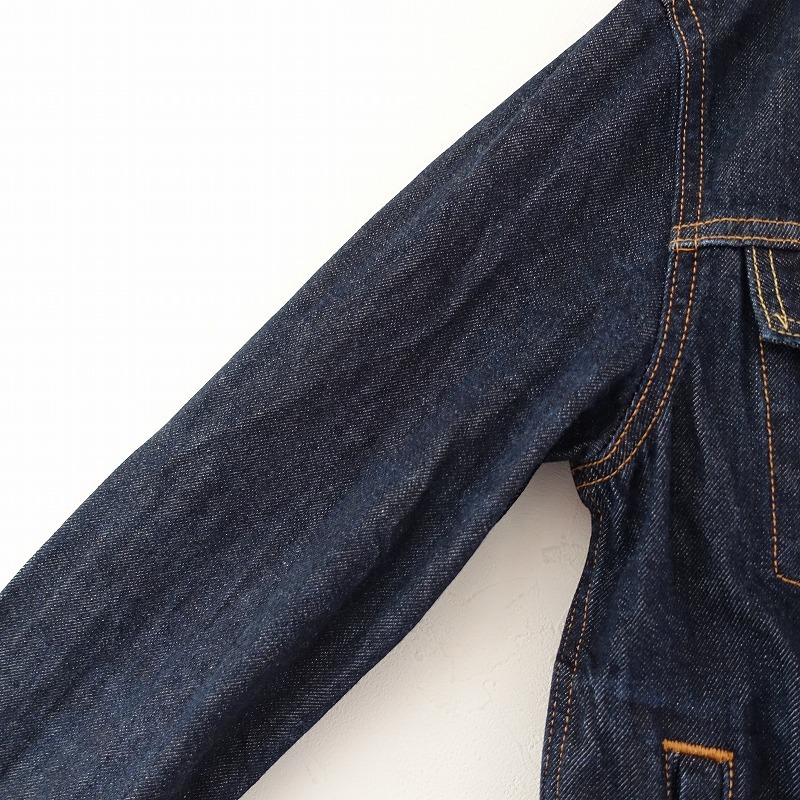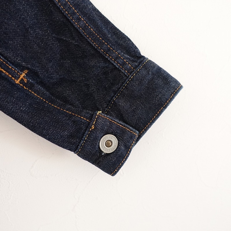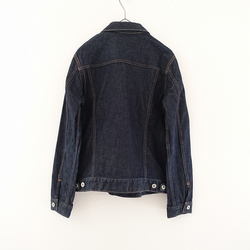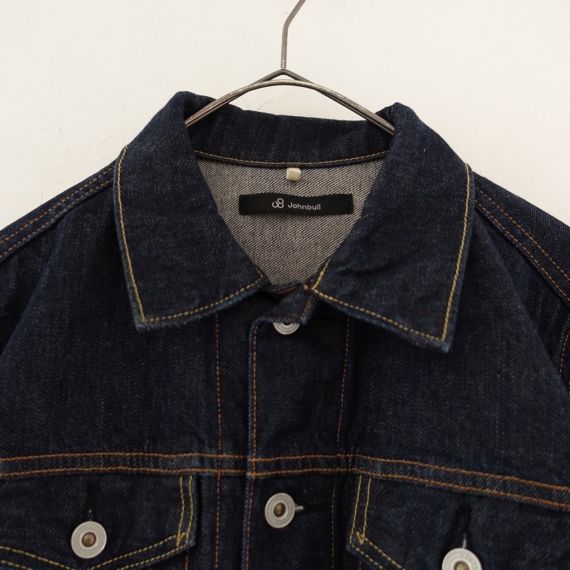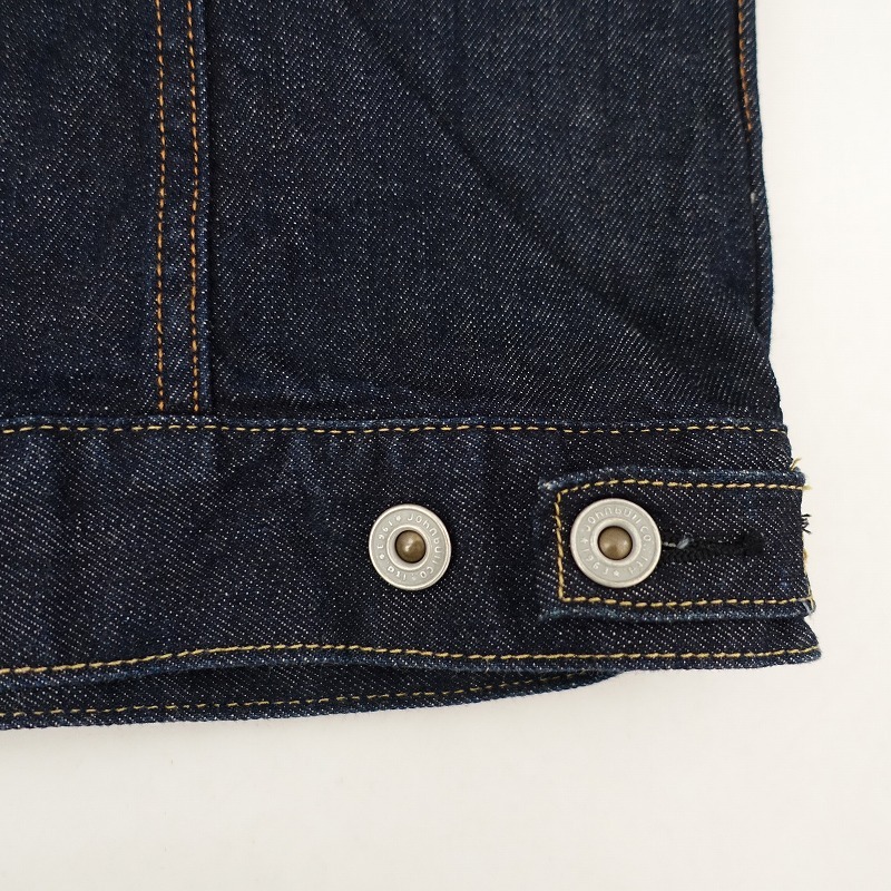 | Johnbullのデニムジャケットです。カラーはネイビーで、フロント&袖口ボタンです。前腰&胸の両サイドにポケットがあり、バック裾両サイドのボタンで調整可能です。 |