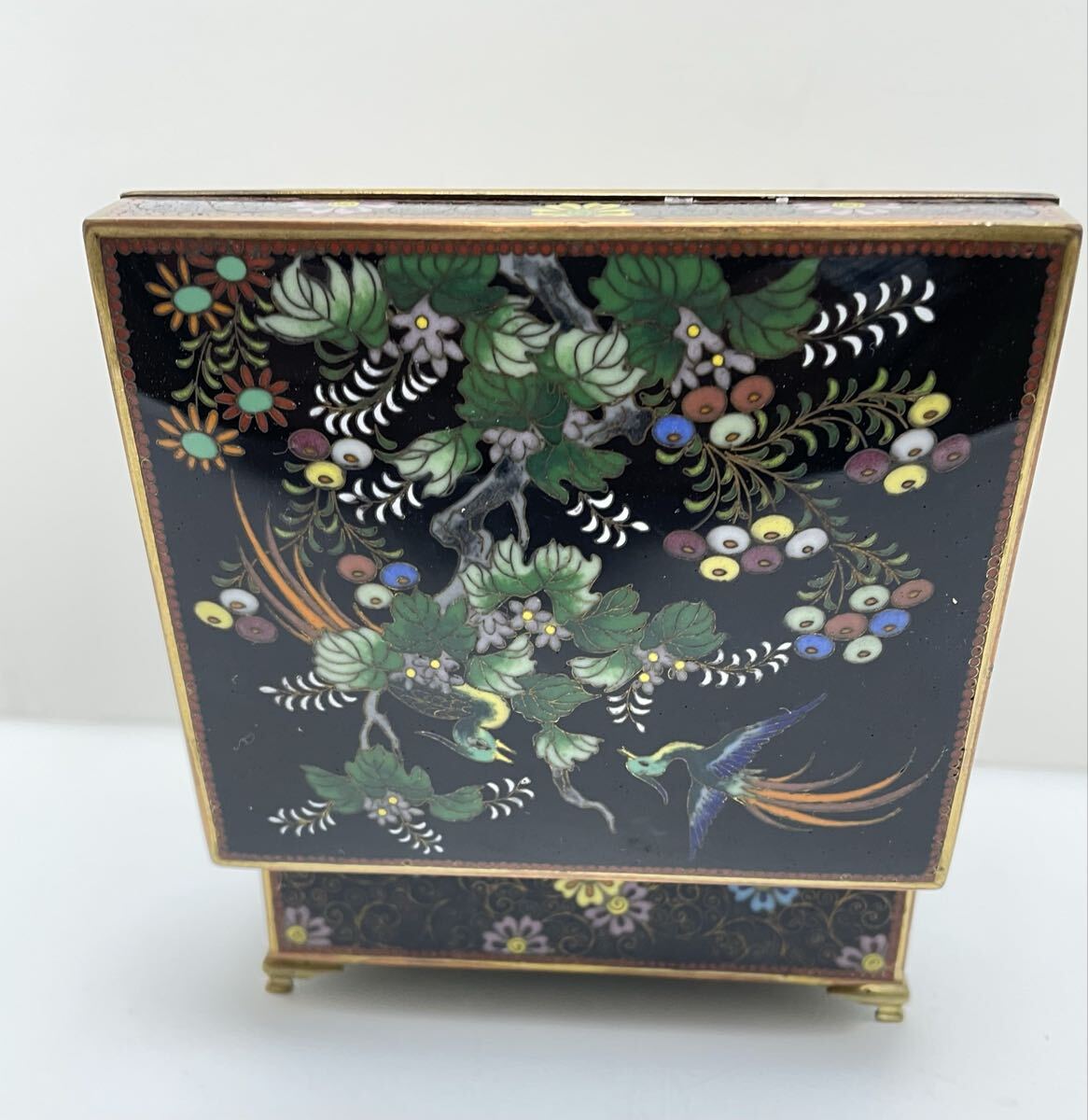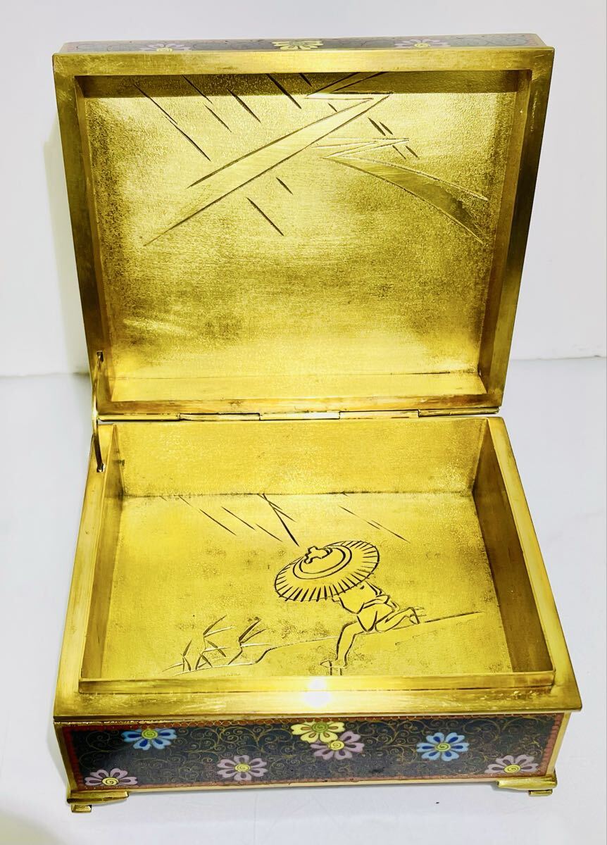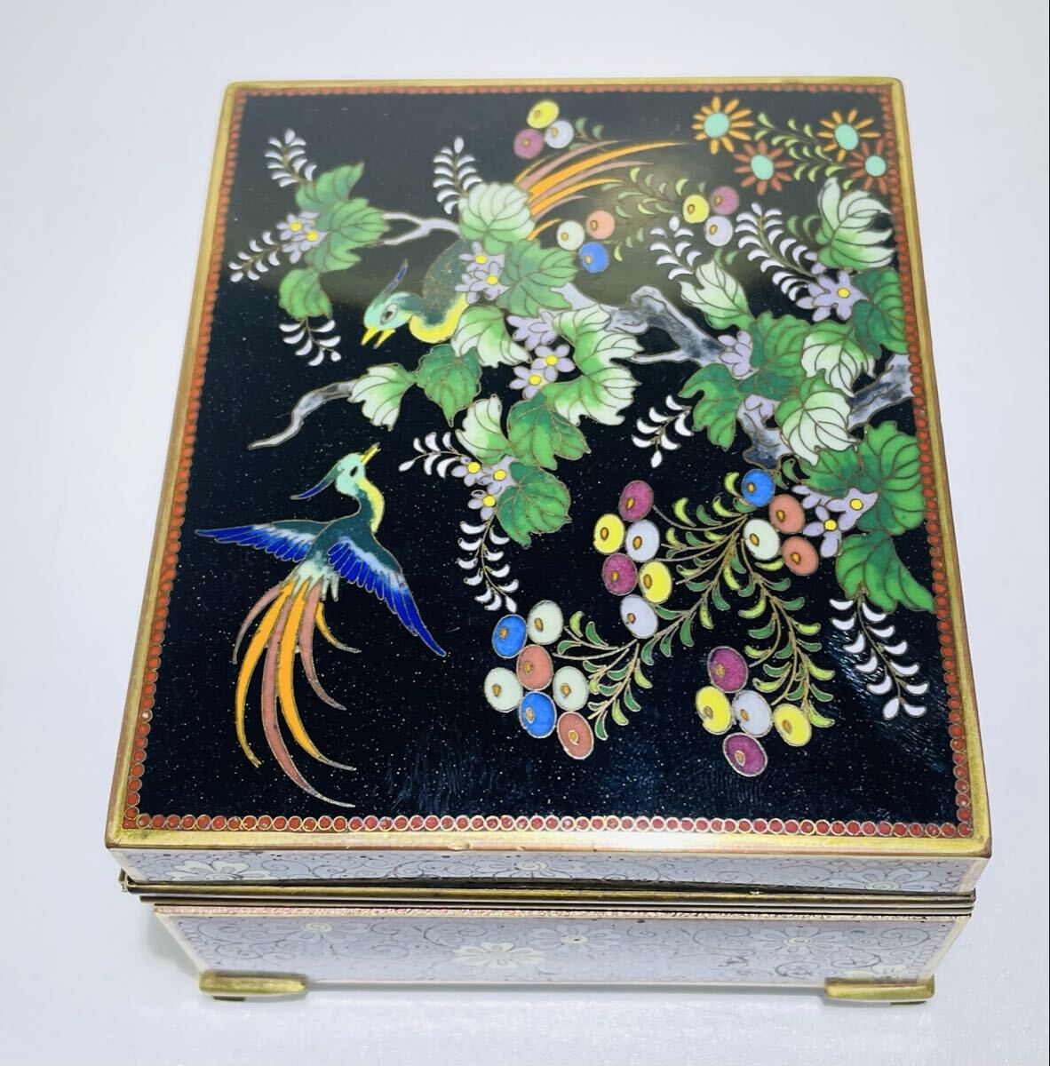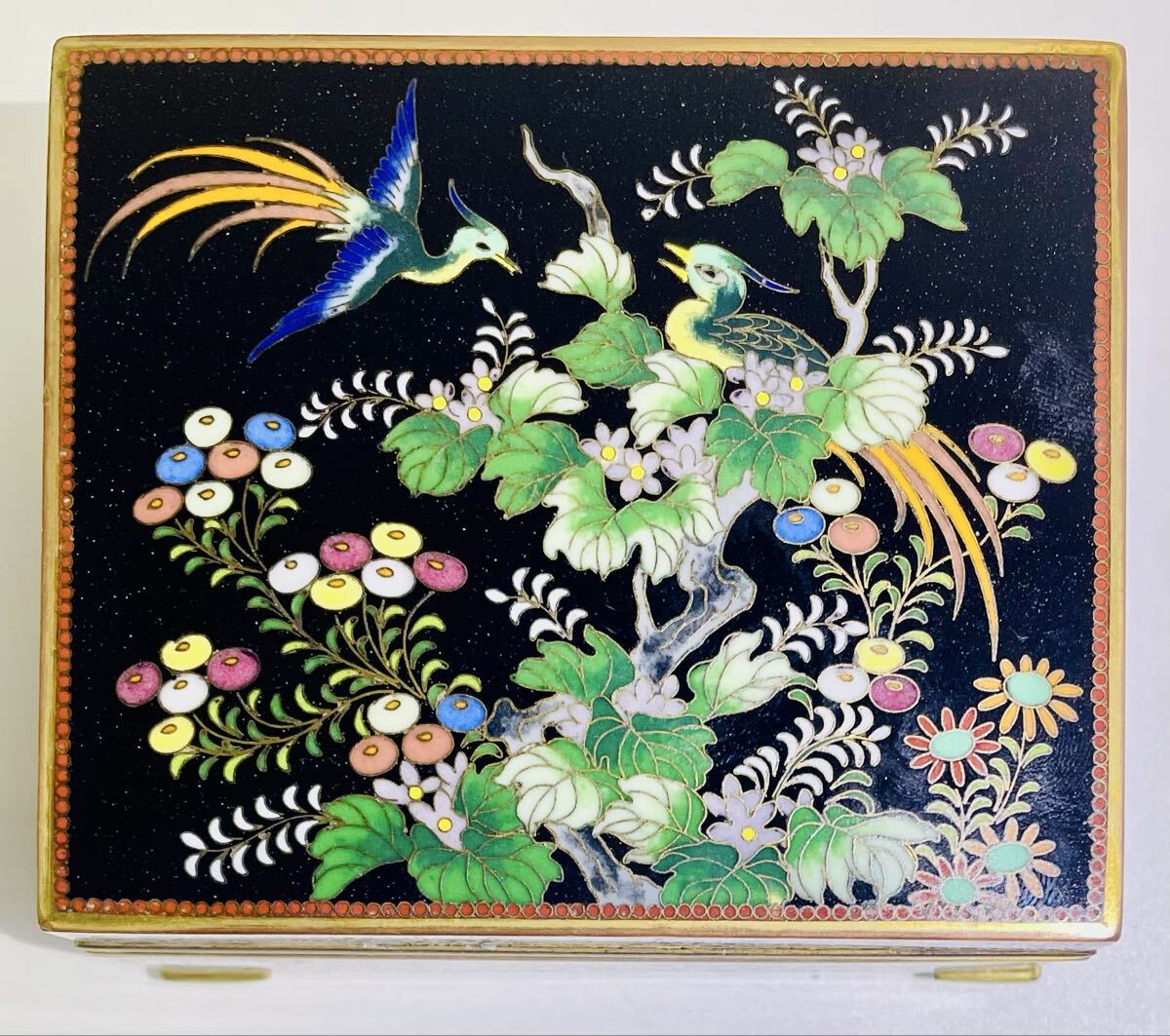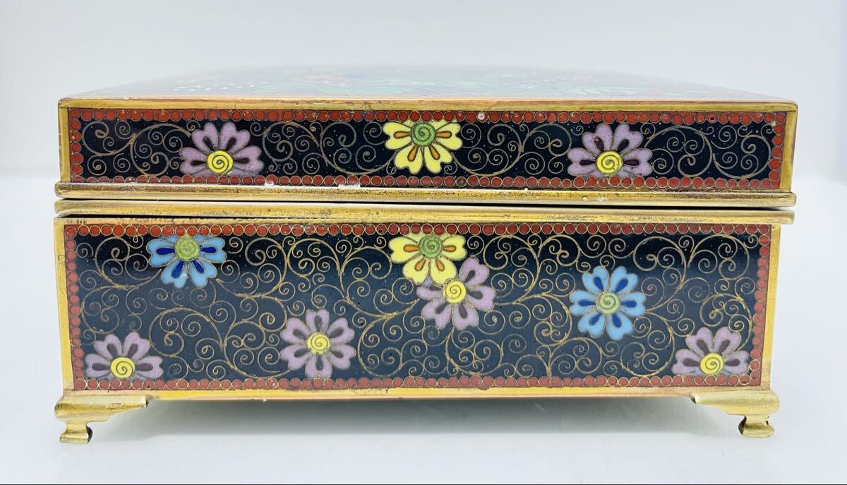 希少 七宝花鳥紋小物入れ 外観 花鳥図 内金 稲妻と夕立景 七宝工芸品 アンティーク 古美術品 古物