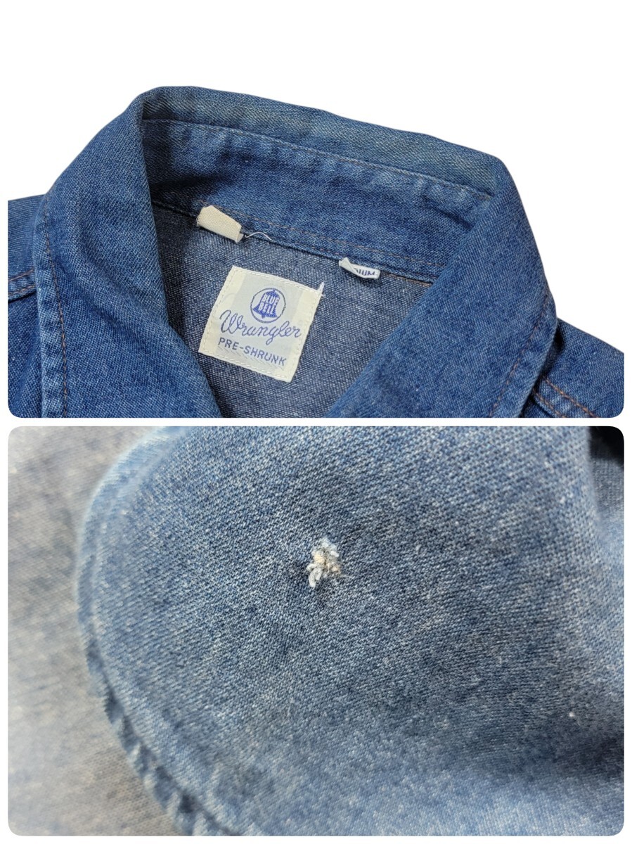 襟裏の折り目の色落ち、後ろ側裾に1ヵ所画像のようなダメージあり。着用には全く問題ありません。予めご了承下さい。※古着やヴィンテージに理解の無い方は購入をお控えください。