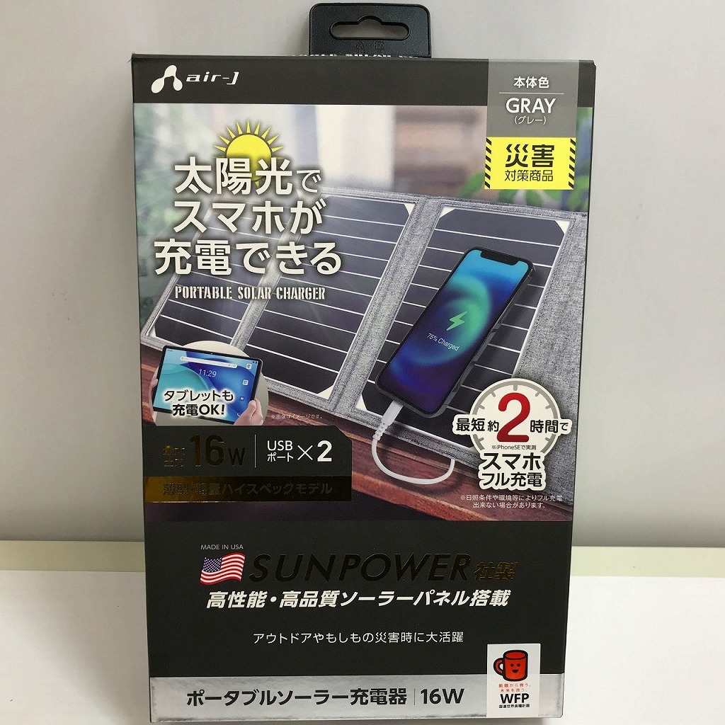 【未使用】air-J ポータブルソーラー充電器 SUNPOWER社製ソーラーパネル搭載 16W 【災害対策にも】 AJ-NSOLAR16W