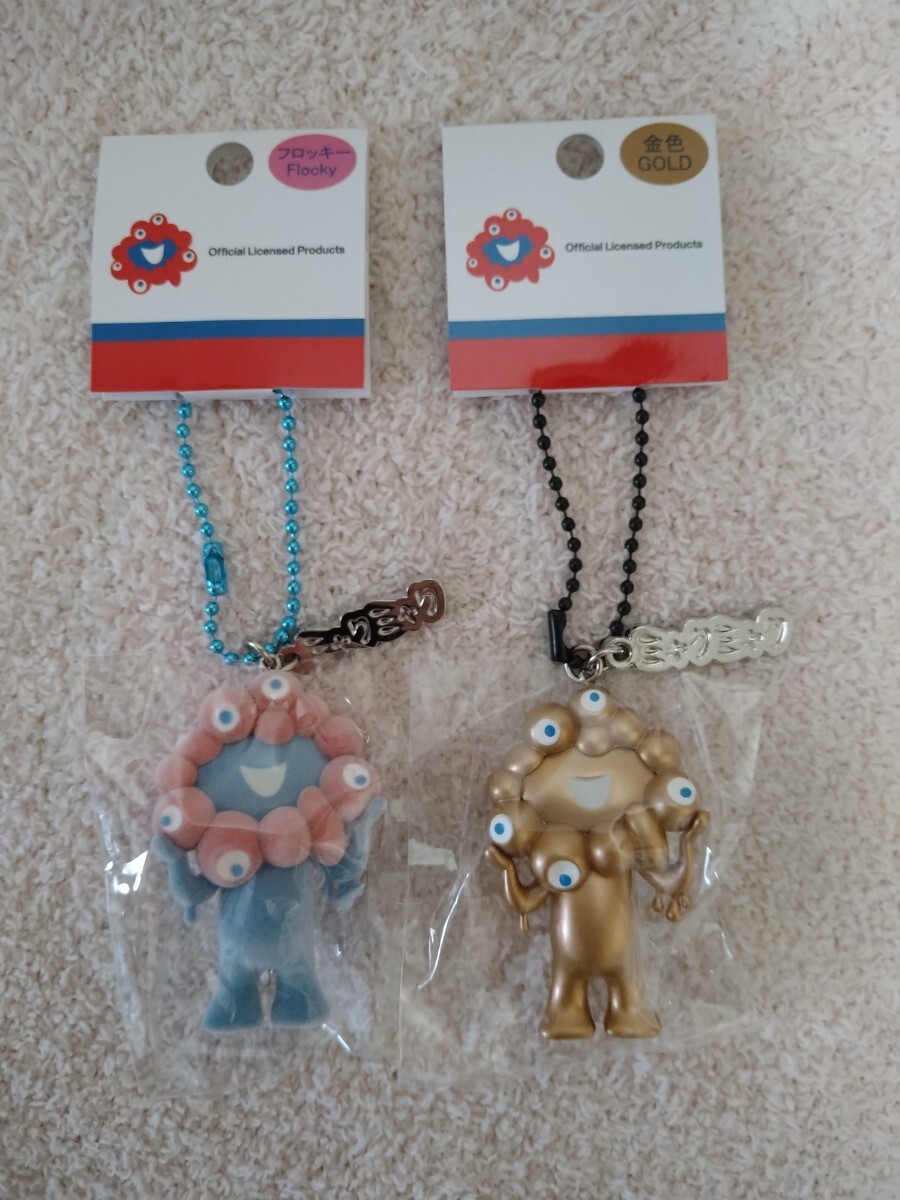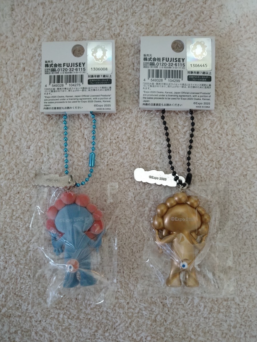 ミャクミャクの立体PVCキーホルダープレート付き、金色&フロッキーの2個セットです!!