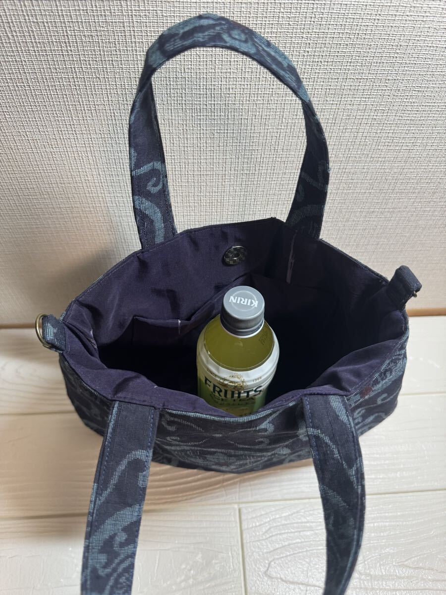 大きめに作っていますので、ペットボトルが縦にも横にも入りますし、ノートも縦に入ります。