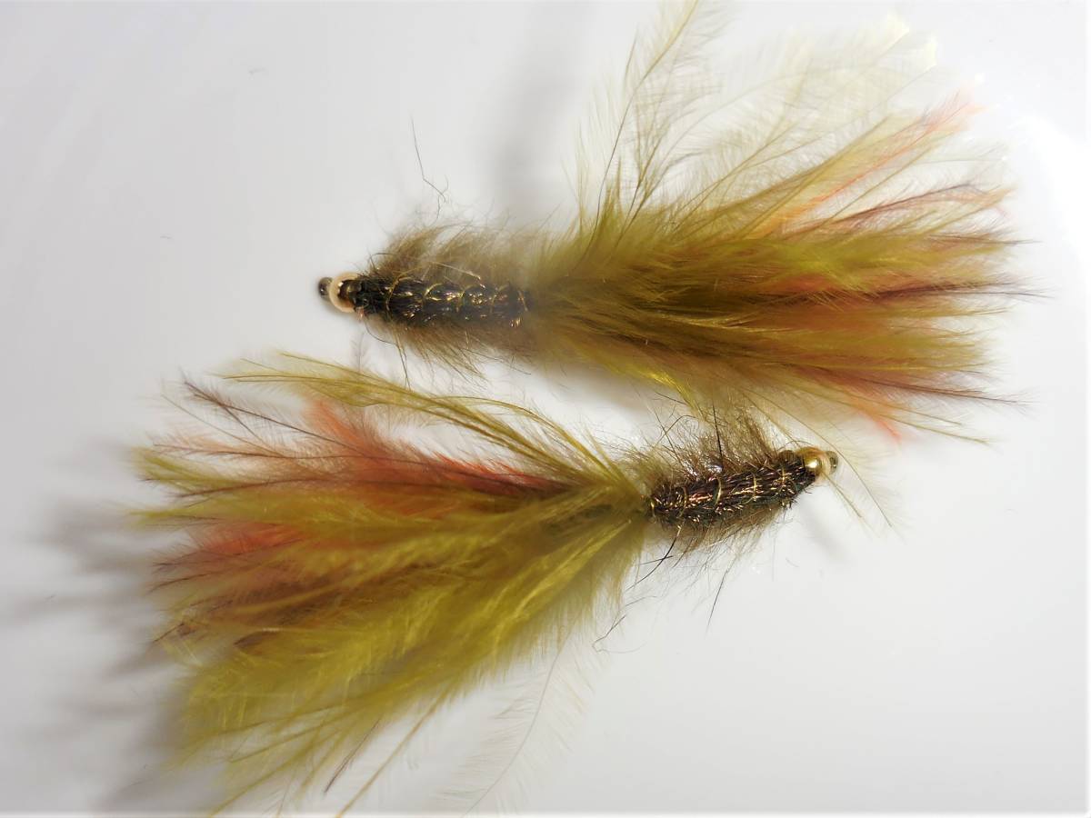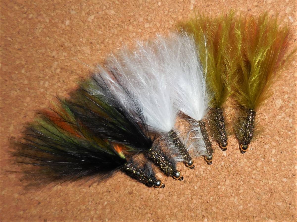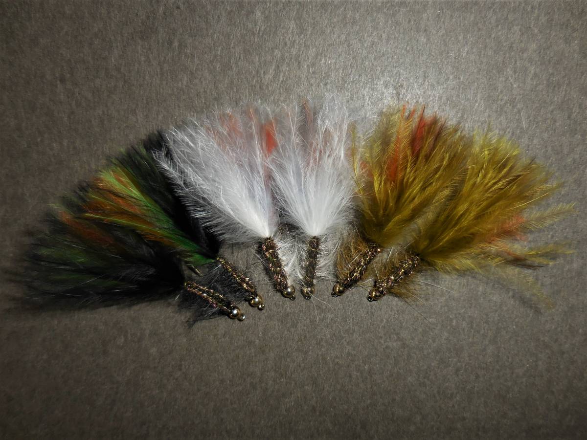 3色のマラブーが、トラウトの好奇心を誘う仕上がりになっています。ボディ背面のピーコックも、興味を引き立てます。特に湖や管理釣り場などの止水域でのリトリーブでの釣りにお勧めです。フライは全てウエイト入りです。