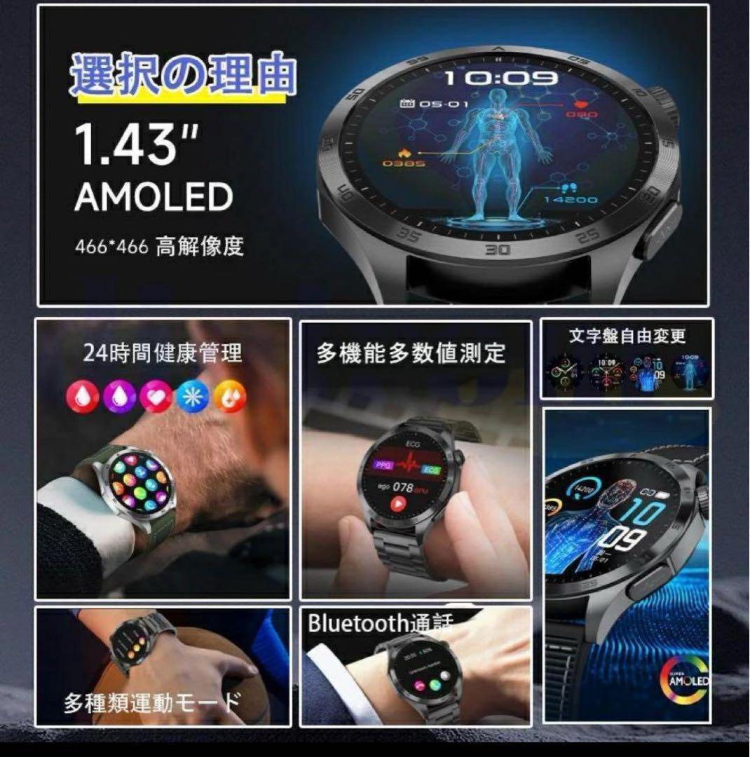 1.43インチ大画面のタッチパネルを採用し、老眼の方にも見やすい!画質がより鮮明になり、高精度な大画面で通知や文字が一目瞭然に表示される。上下左右のスライド操作で機能の切替も簡単です。本体で6つの表盤画面搭載する以外、専用アプリで50+種類の文字盤を自由に設定することができます。