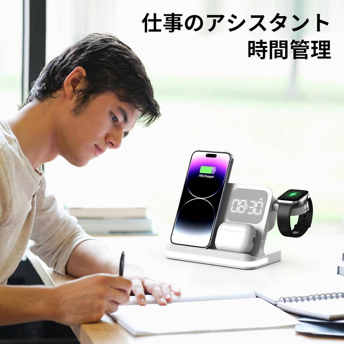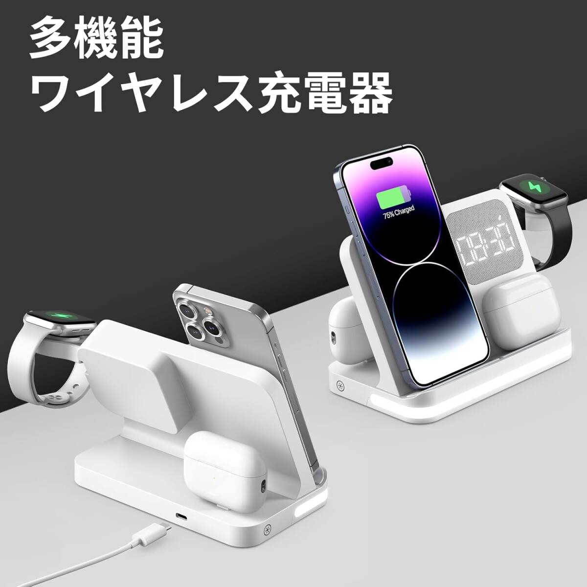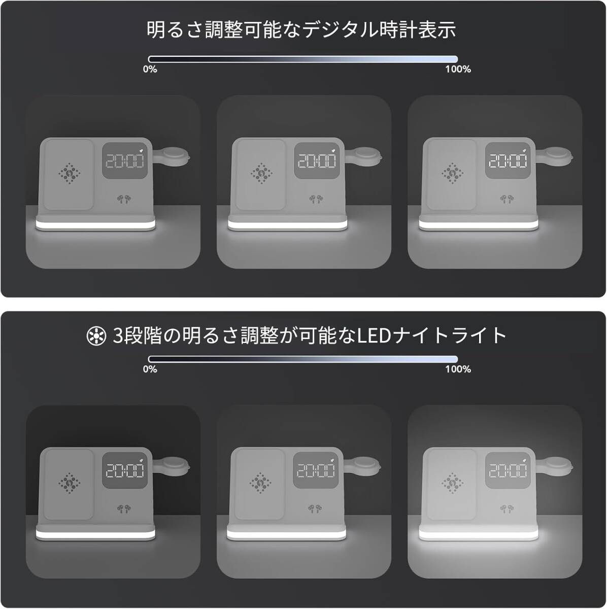 4in1 ワイヤレス充電器 目覚まし時計付き アップルウォッチ 充電スタンド 同時充電 QC3.0アダプター付き