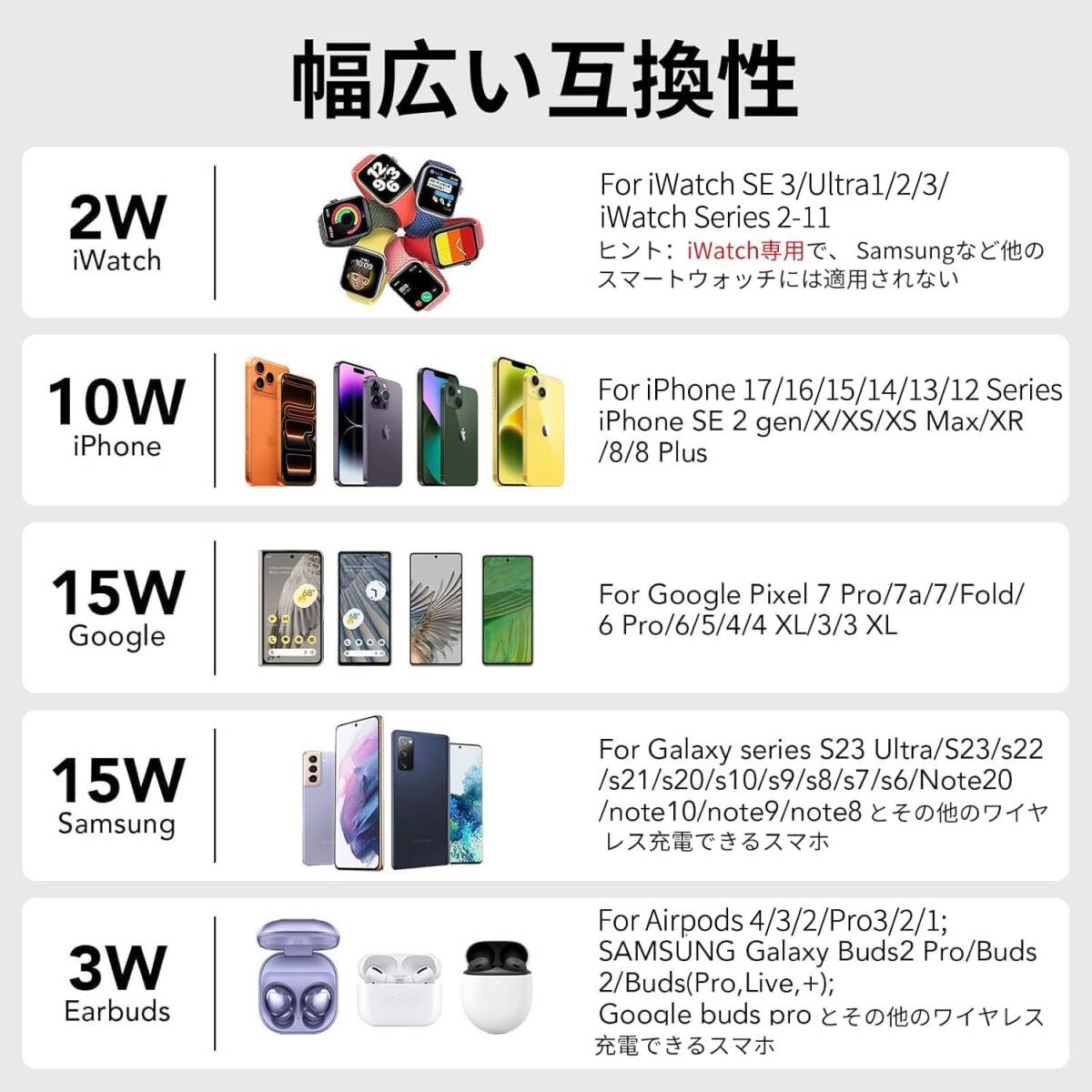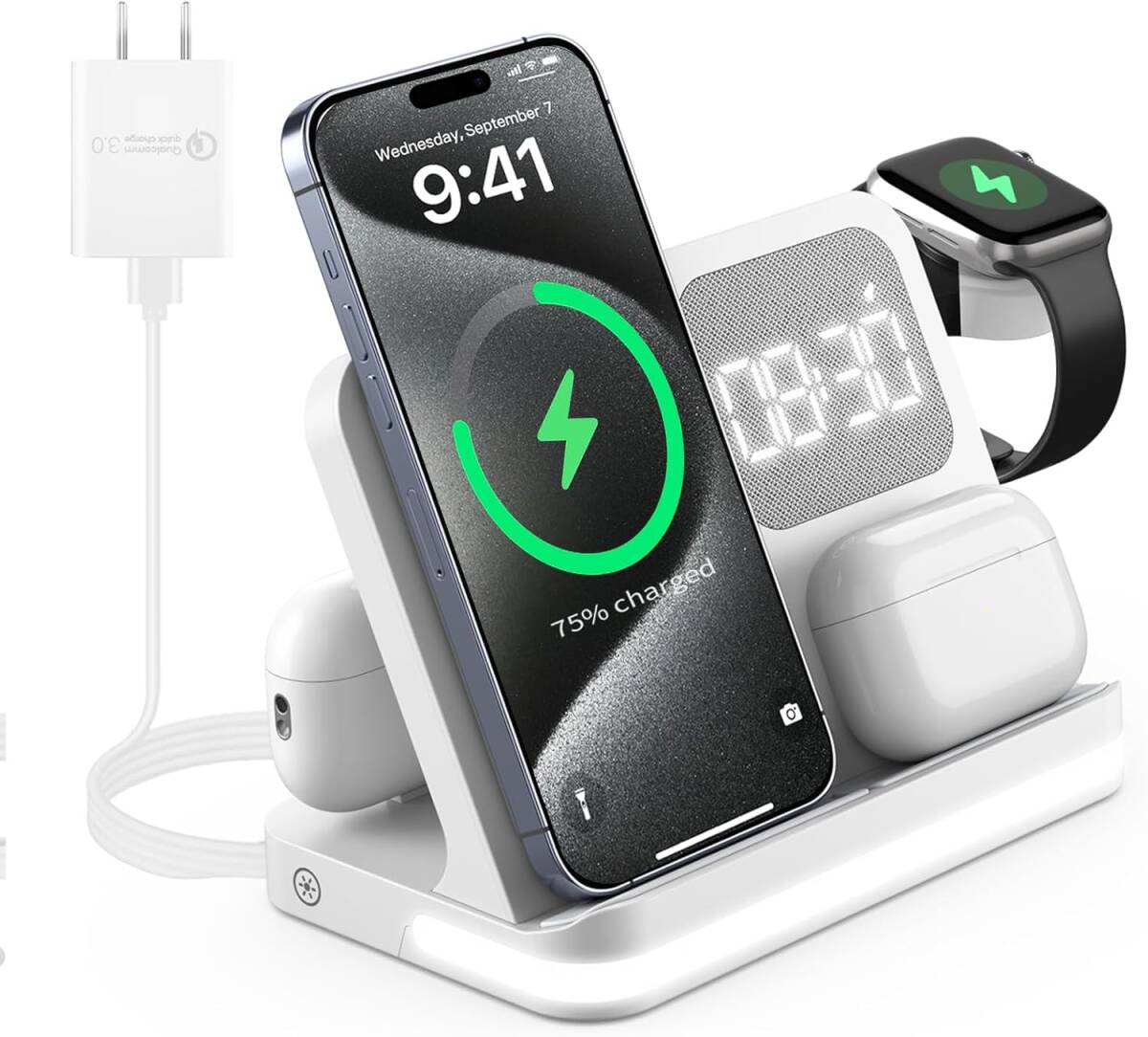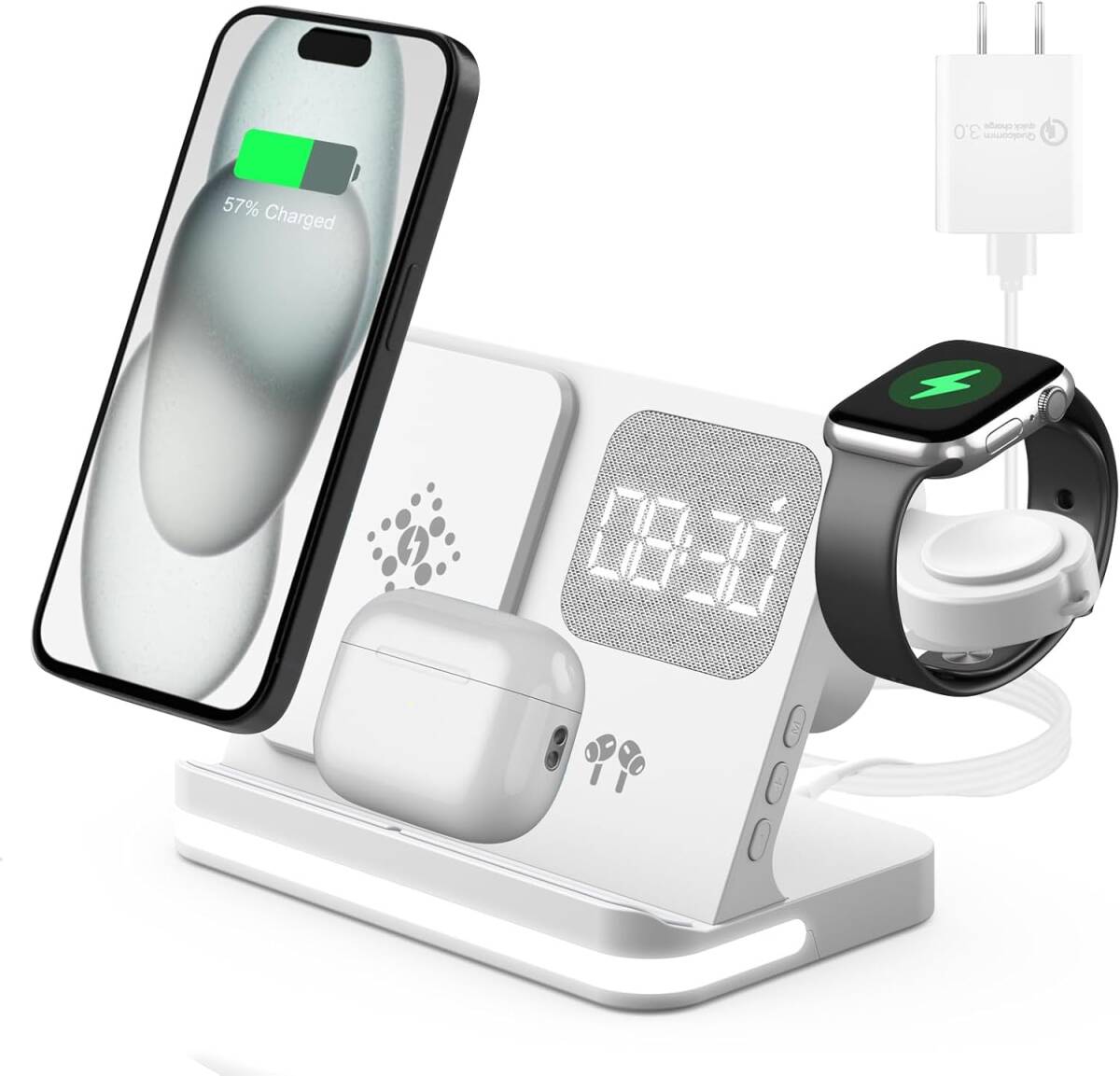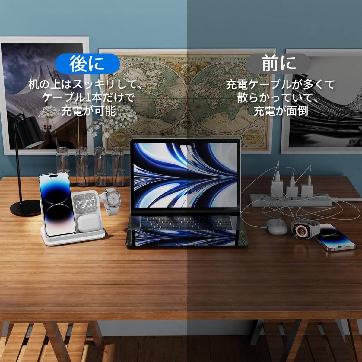 4in1 ワイヤレス充電器 目覚まし時計付き アップルウォッチ 充電スタンド 同時充電 QC3.0アダプター付き
