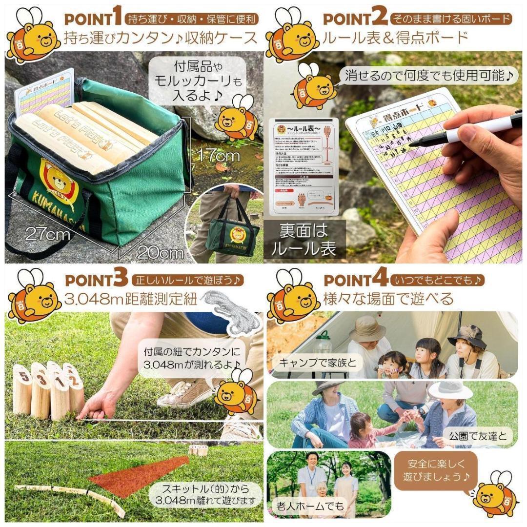 〇【基本の楽しみ方】投棒を投げ、スキットルを倒します。 スキットルを倒し、そのスキットルに印字された数字が獲得できたり、複数のスキットルを倒したり、スキットルの数と同等のポイントを獲得します。 めざせ50点!
