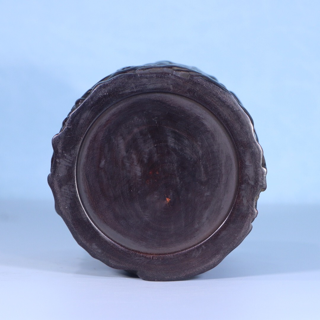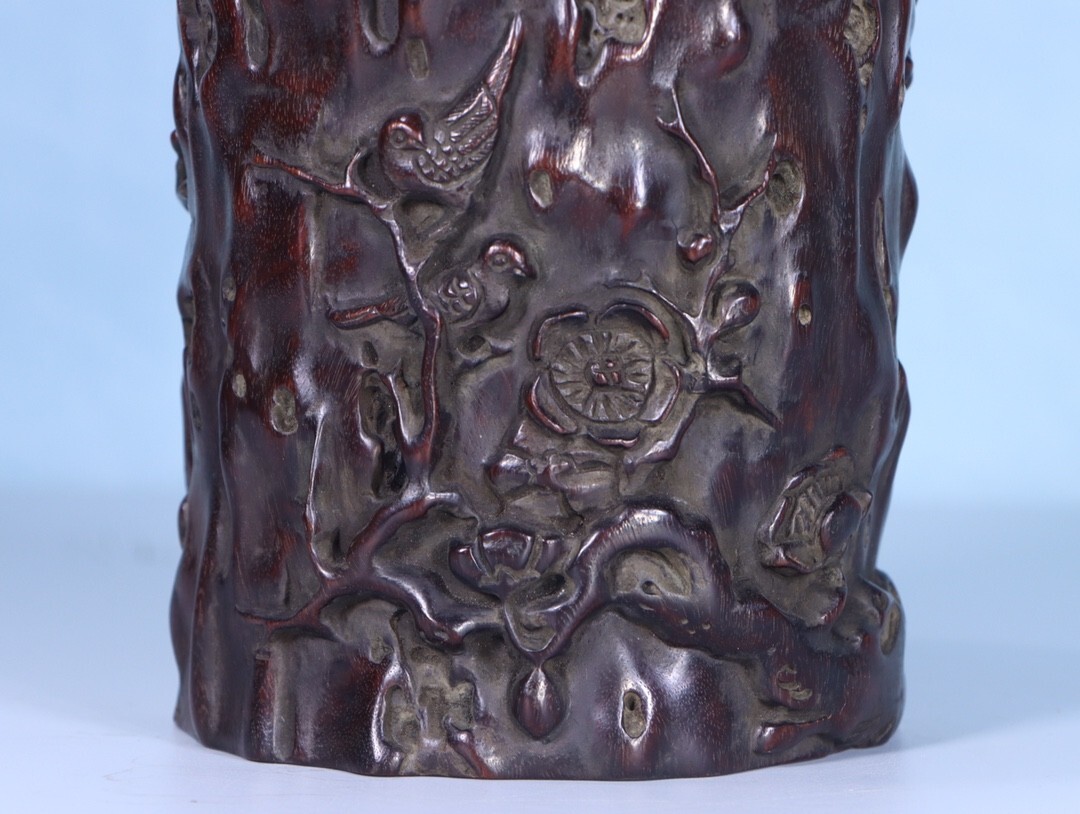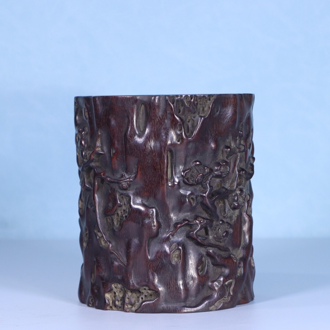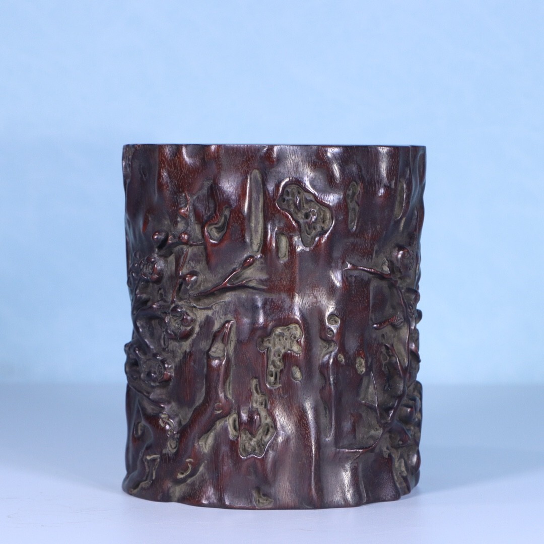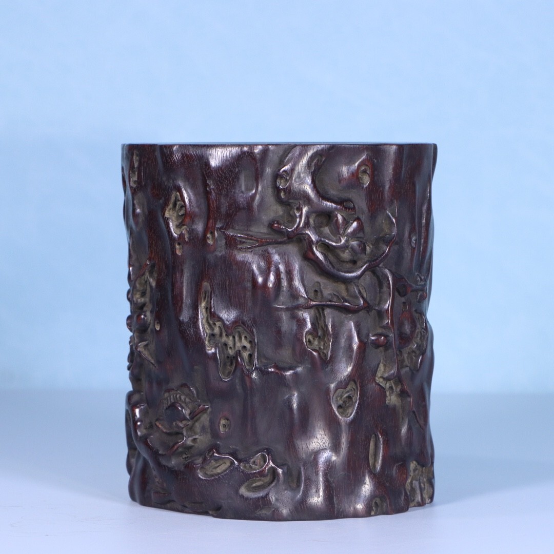 「清時代 紫檀の木 彫り 梅花樹パイル形 喜上眉梢 筆筒」極細工 擺件 賞物 古美術 骨董品 旧蔵出