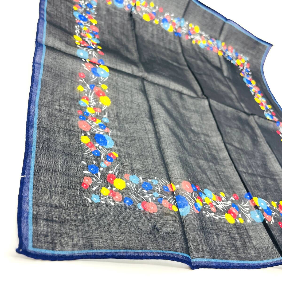 ハンカチ バンダナ ブラック系 マルチカラー 花柄 フラワーモチーフ ネイビー縁 ラグジュアリー エレガント