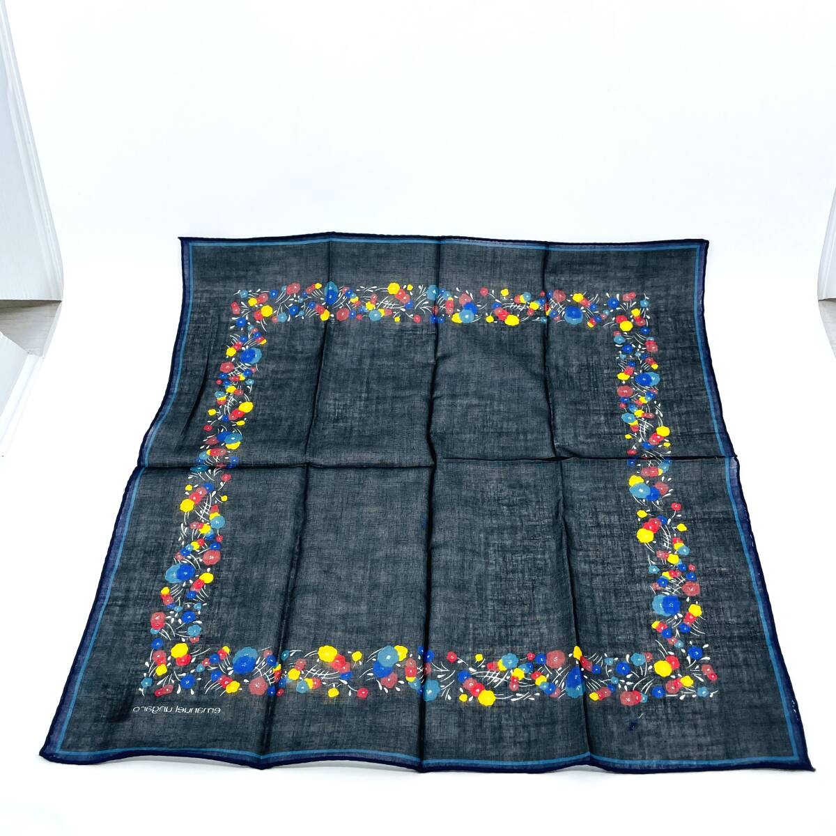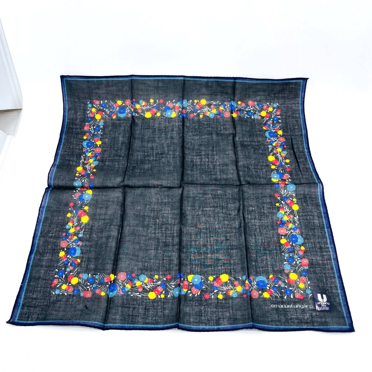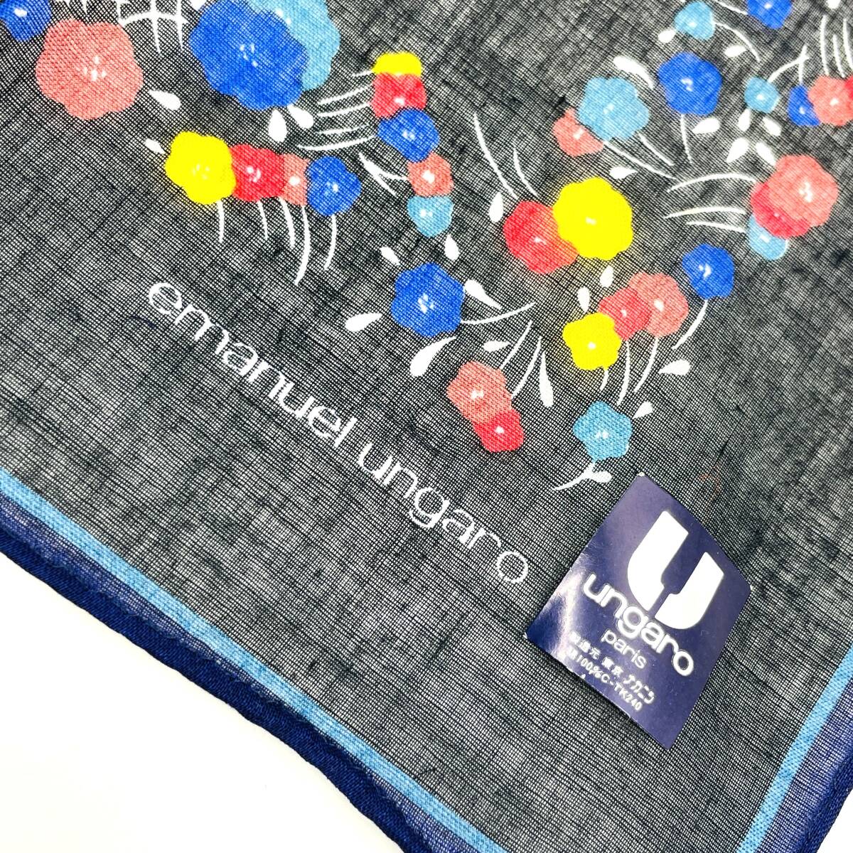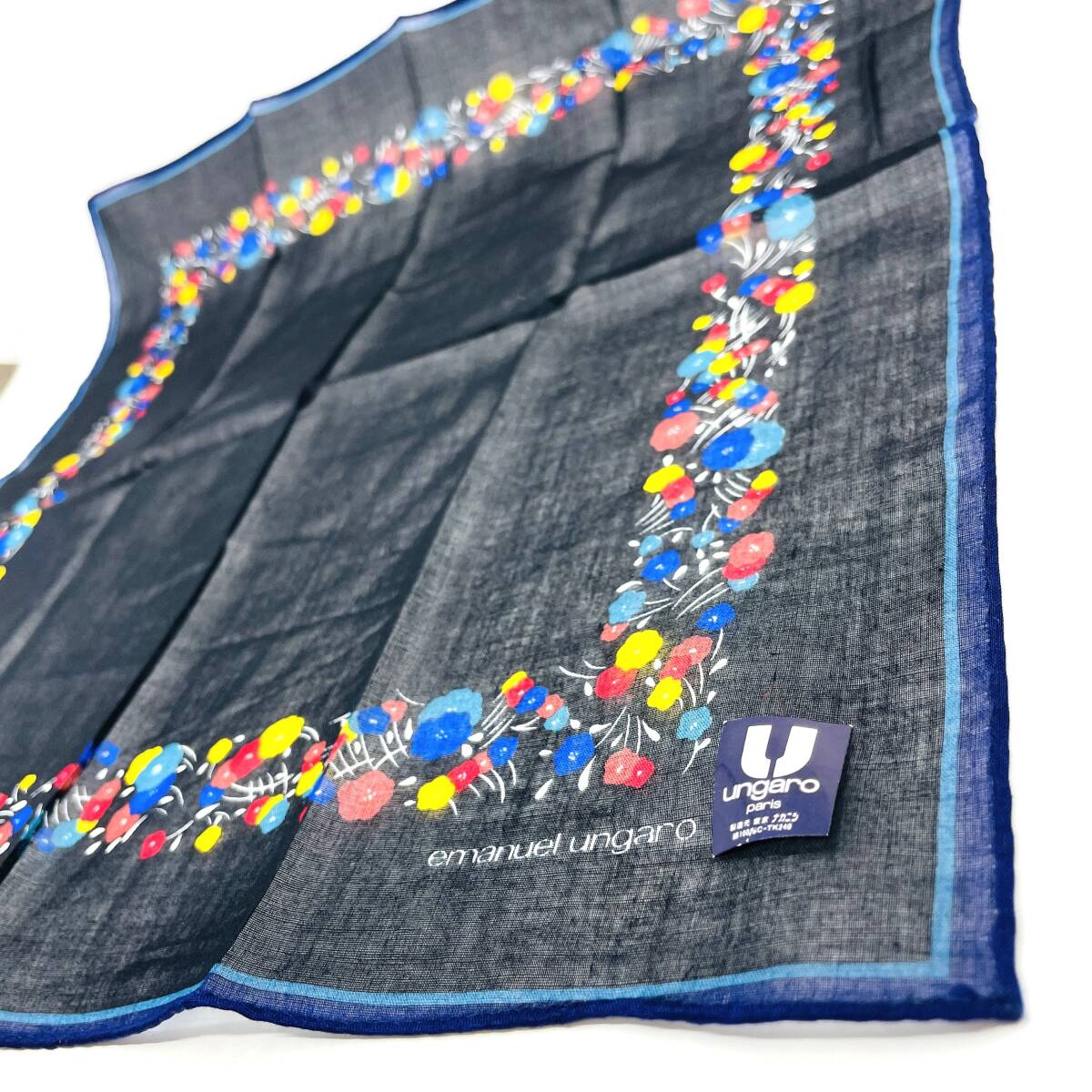 【シール付き未使用品】Emanuel Ungaro エマニュエル ウンガロ ハンカチ バンダナ ブラック系 マルチカラー 花柄 フラワー ネイビー縁